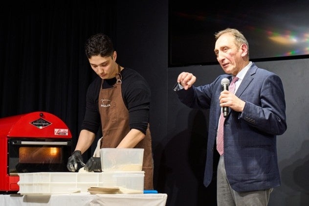 ジョヴァンニさんが、出来立てのピンサを登壇者にふるまい、葛原さんは「ピザよりも生地表面がカリカリでブオーノ!」、高橋さんは「みんな好きな味だから、珍しいものですがすぐに受け入れられそう」、小林さんは「後味が軽くて、ヘルシーだと感じます」と感想が寄せられました。