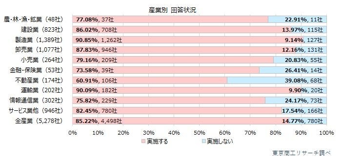 産業別では、「実施する」と回答した割合が最も高い産業は製造業の90.8%(1,389社中、1,262社)だった。以下、運輸業90.0%(202社中、182社)、卸売業87.8%(1,077社中、946社)、建設業86.0%(823社中、708社)、サービス業他82.4%(946社中、780社)と続く。