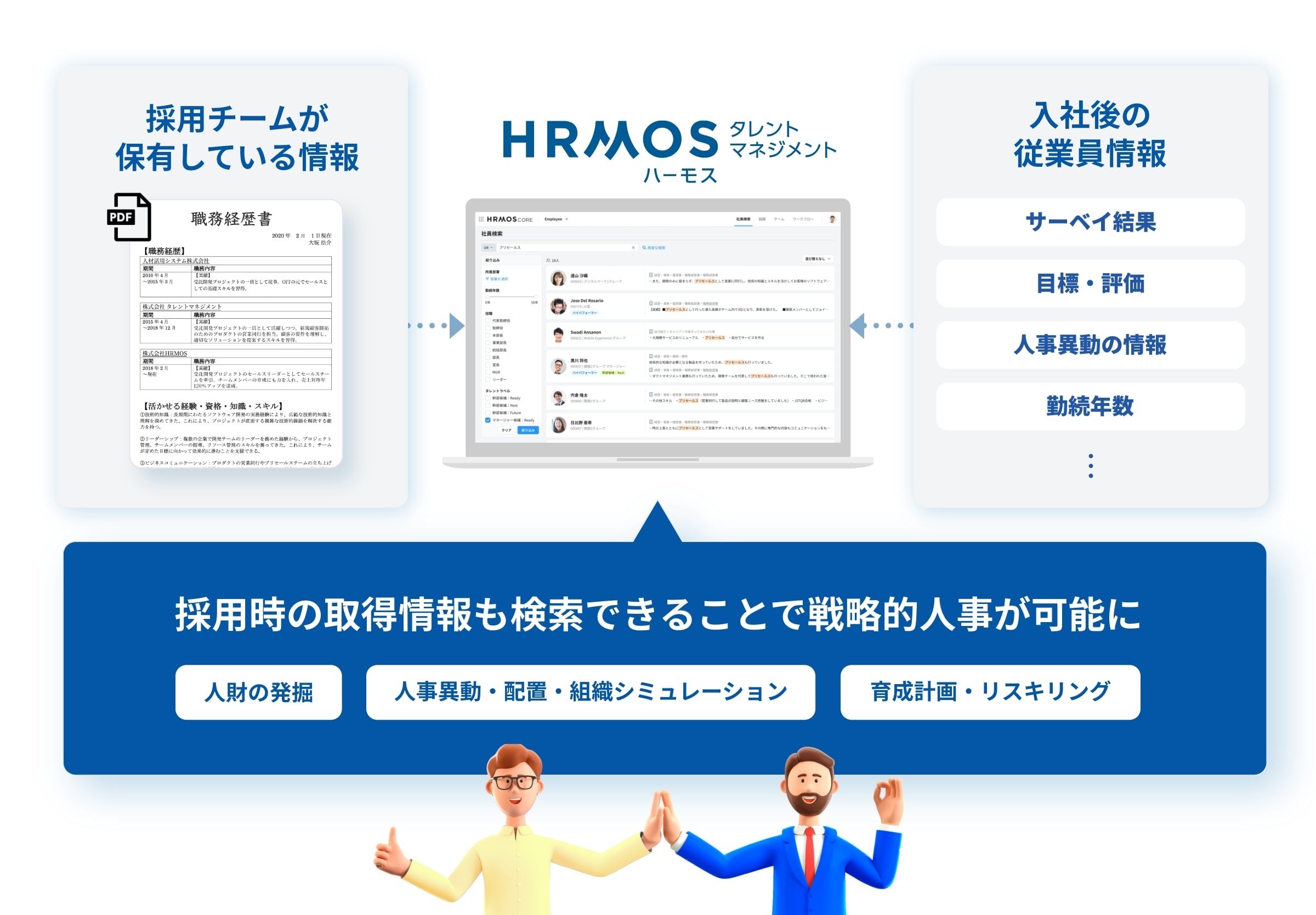 また、HRMOSシリーズで展開している採用管理システム「HRMOS採用」と、人財活用システム「HRMOSタレントマネジメント」を併用することで、職務経歴書のファイルやテキスト情報が自動登録されます。採用担当者がHRMOS採用で管理している候補者情報のステータスを「入社」に変更することで、氏名・連絡先・職務経歴書のファイルが自動でHRMOSタレントマネジメントの従業員データベースに登録され、工数を大幅に削減できます。