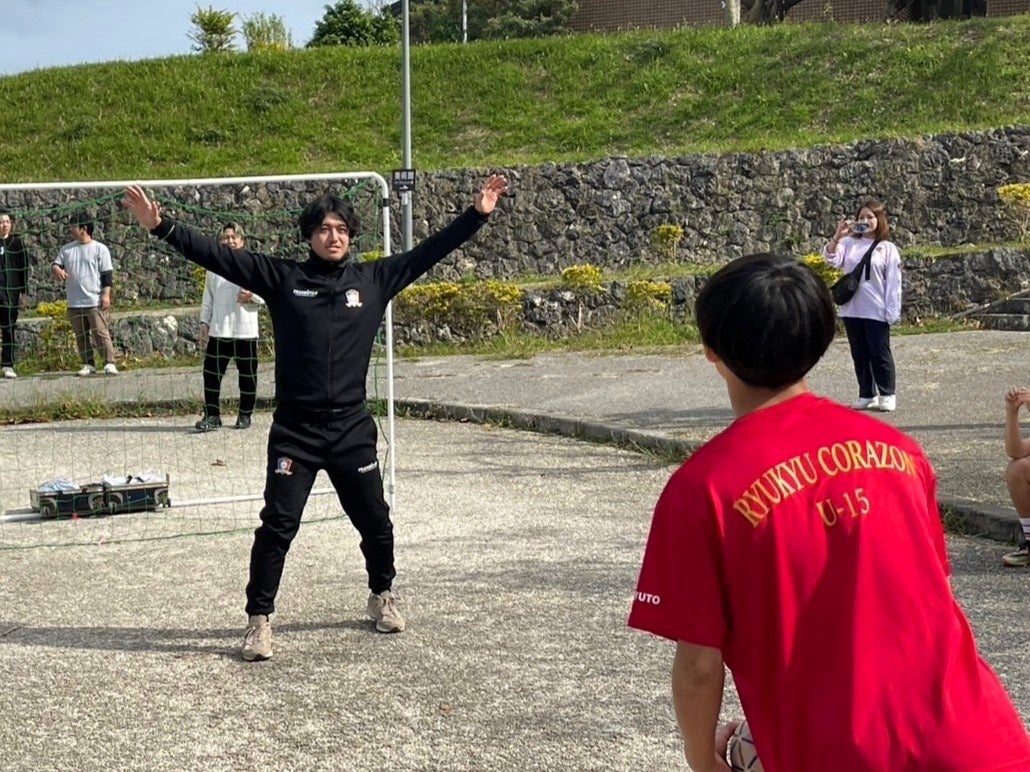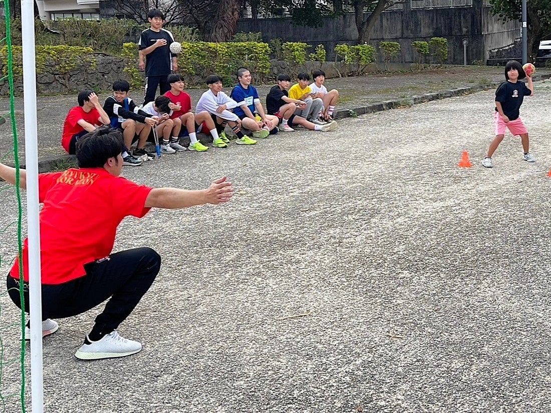 <ハンドボール体験では、琉球コラソンの選手がキーパー役に!>