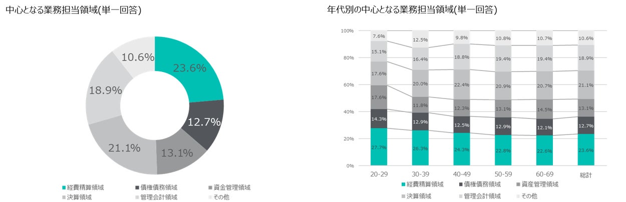 ・年代別の中心となる業務担当領域(単一回答)では「経費精算領域」で総計と最も差が生じており、20代が+4.1%だった。その他は大きな差はなかった