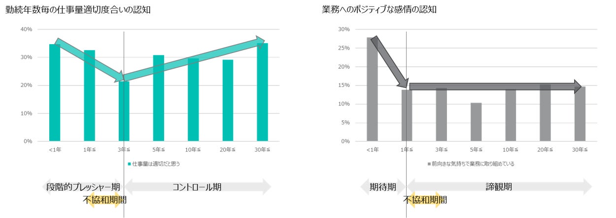 ・業務へのポジティブな感情は1年を過ぎて急激に落ち込み、それ以降はほぼ横ばいであり、1年目で下がった感情面は再度ポジティブな方向へ浮上することがない様子が伺える