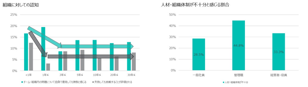 ・入社後、時間を経るにつれて、問題に対して意見しても無駄と感じたり、挑戦に対して評価されないと感じるなど、組織に対しての無気力感を覚える様子が伺える