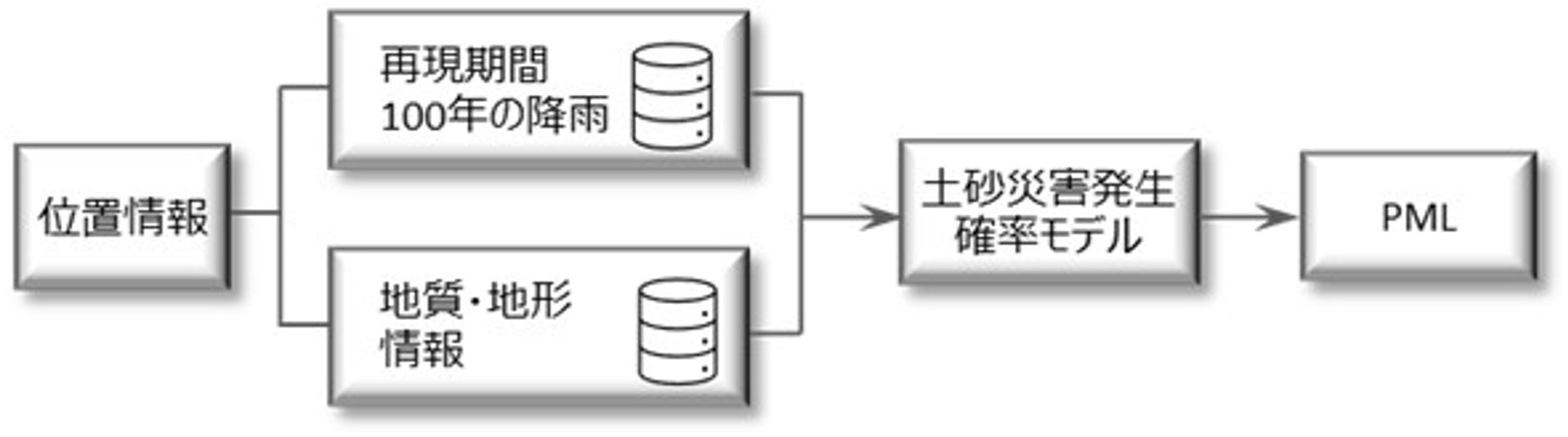 具体的には、土砂災害の誘因となる降雨指標を定めた上で、過去1万6千件以上の土砂災害事例と降雨との関係を分析することで、土砂災害の発生確率をモデル化しました。また、気候予測データベースd4PDF(*3)の解析により、日本全国における再現期間100年の降雨指標値を算出しました。これらの情報を、全国の地質・地形に関するデータベースの情報と併せてモデルに与えることで、評価対象地の土砂災害PMLを確率的に評価します。