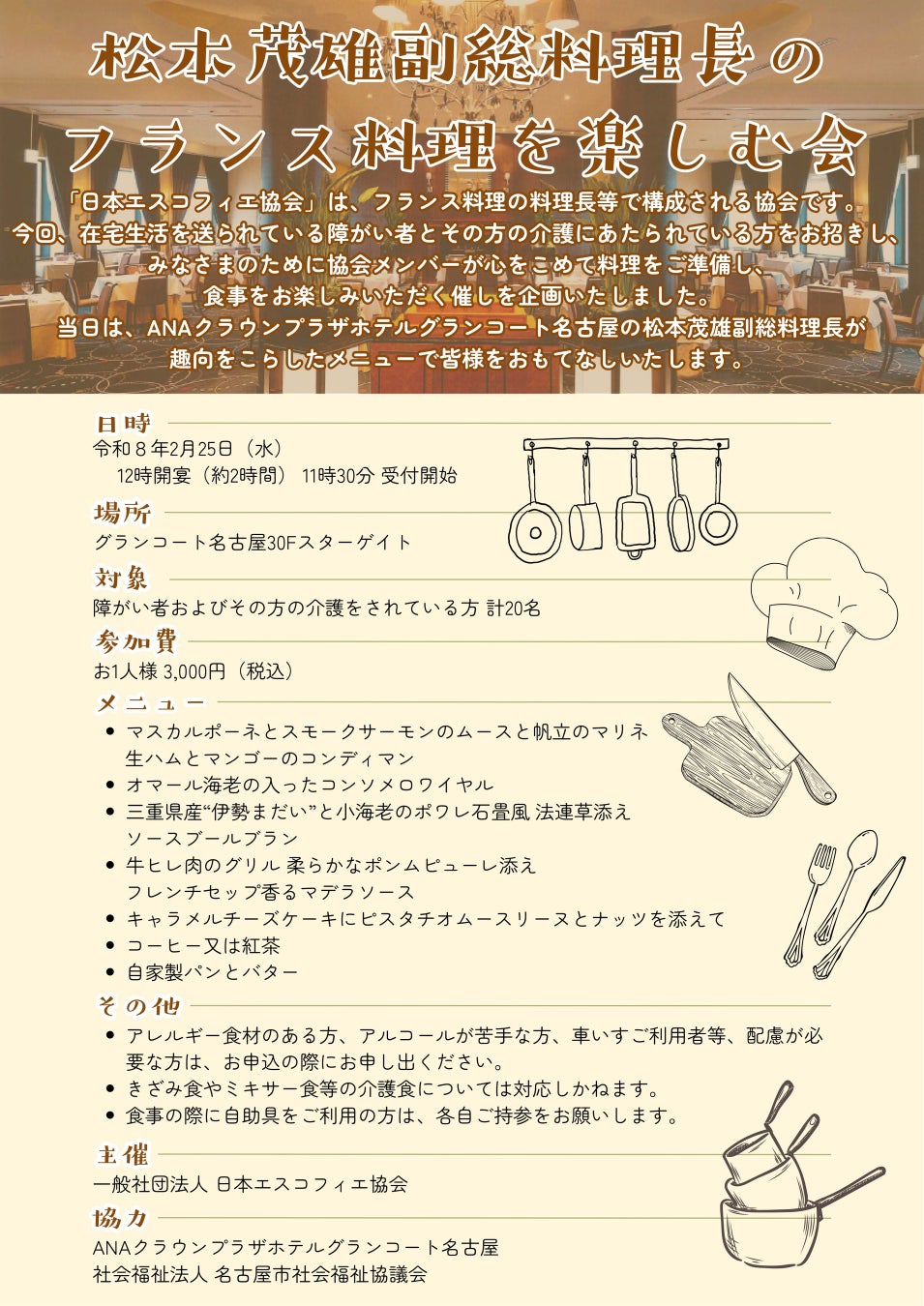 社会福祉法人名古屋市社会福祉協議会では、企業の社会貢献活動の支援をしています。このたび一般社団法人日本エスコフィエ協会よりご相談を受け、市内の障害者団体のみなさまを対象とした「ホテルでフランス料理を楽しむ社会福祉食事会」が開催されます。