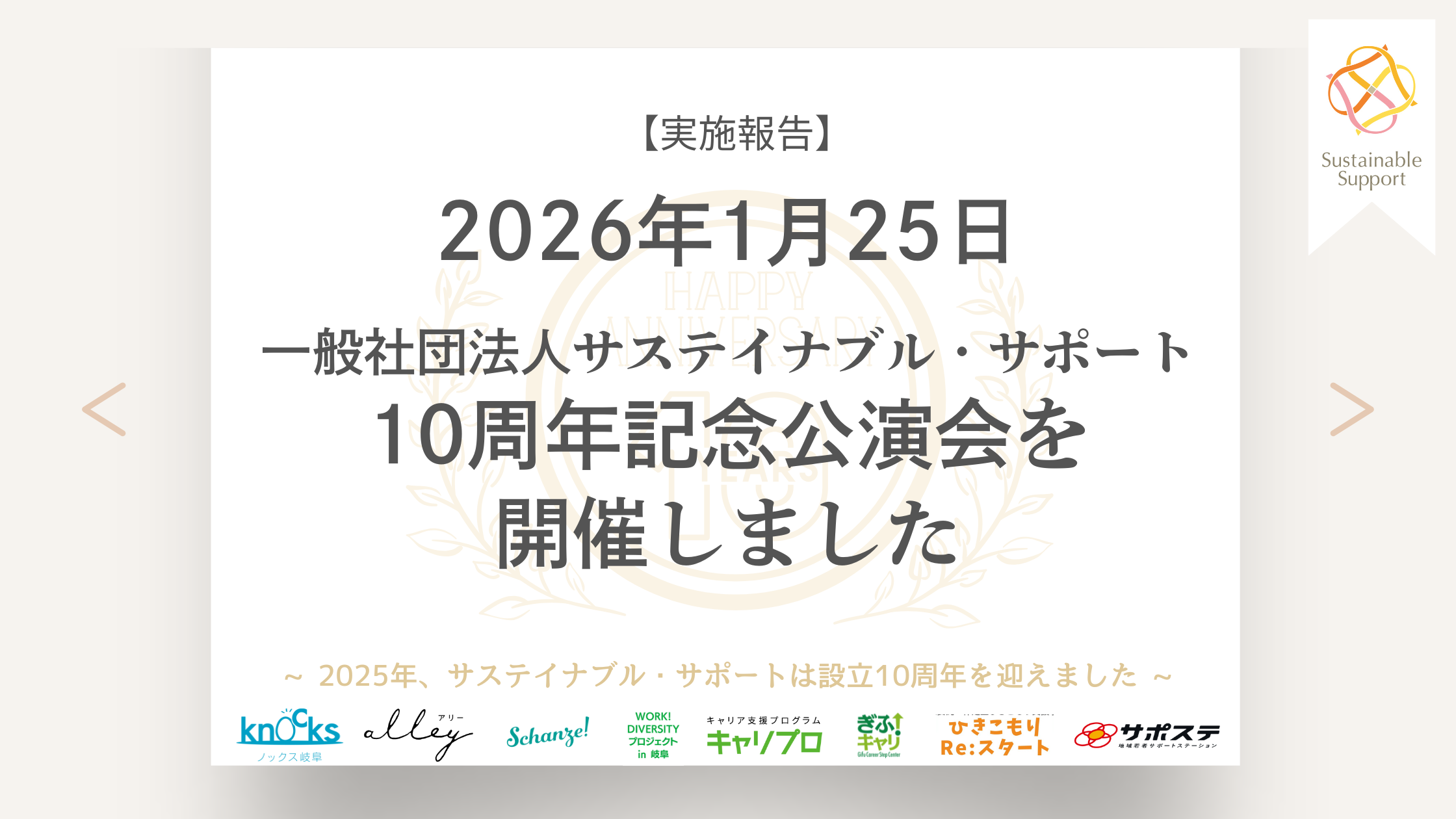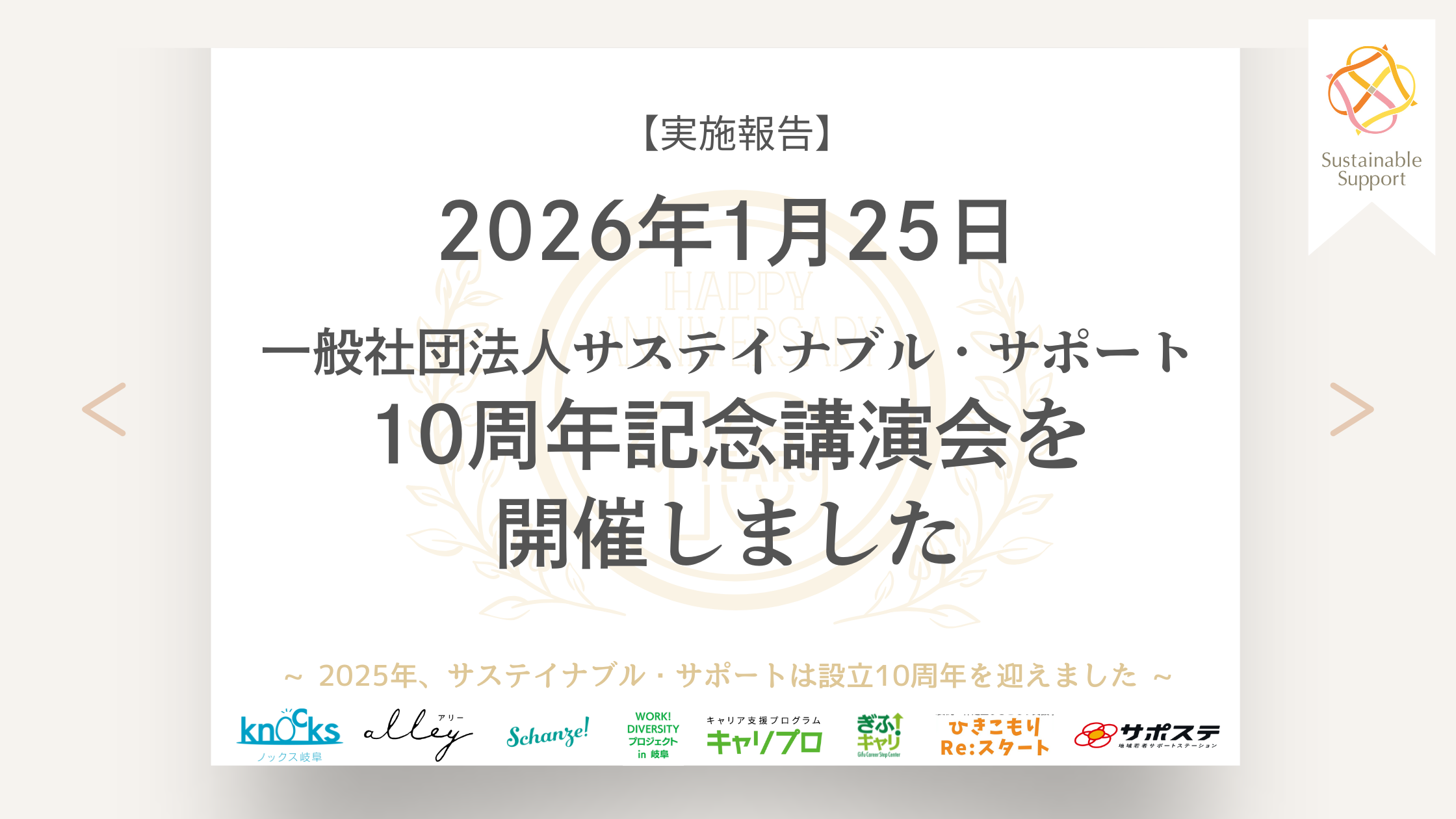 一般社団法人サステイナブル・サポート(代表理事:後藤千絵)は、2026年1月25日(日)、じゅうろくプラザ(岐阜市)にて、【発達障害をめぐる岐阜の現在地とこれから ~つながりの視点と未来を考える~】をテーマとした講演会・シンポジウムを開催しましたのでご報告いたします。