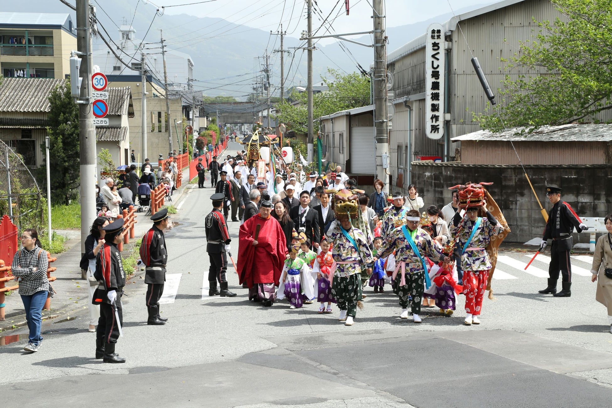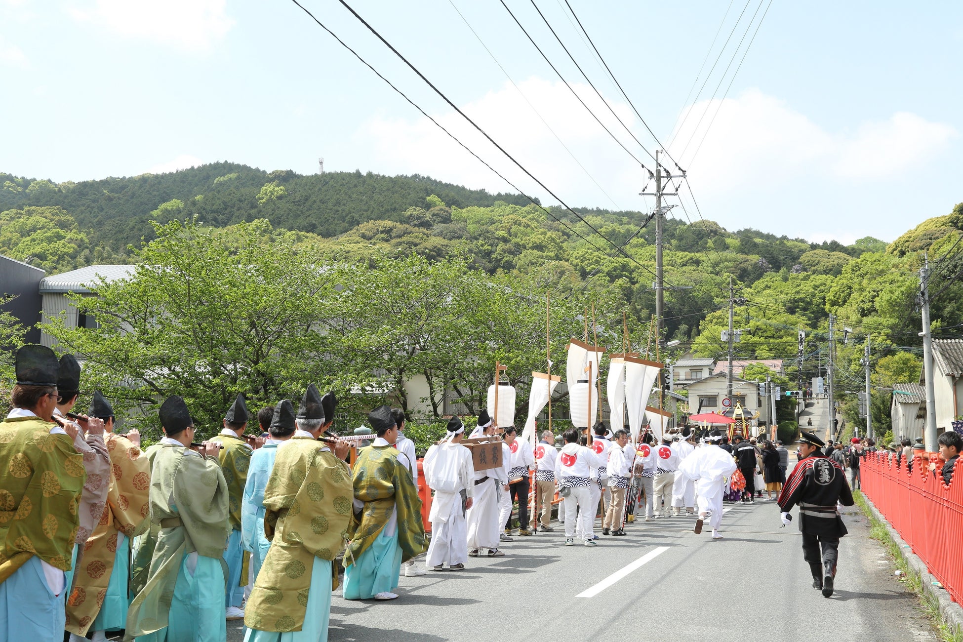 春の陽気に包まれ、笛の音色が鳴り響く中、御神輿行列は優雅にゆっくりと進みます。