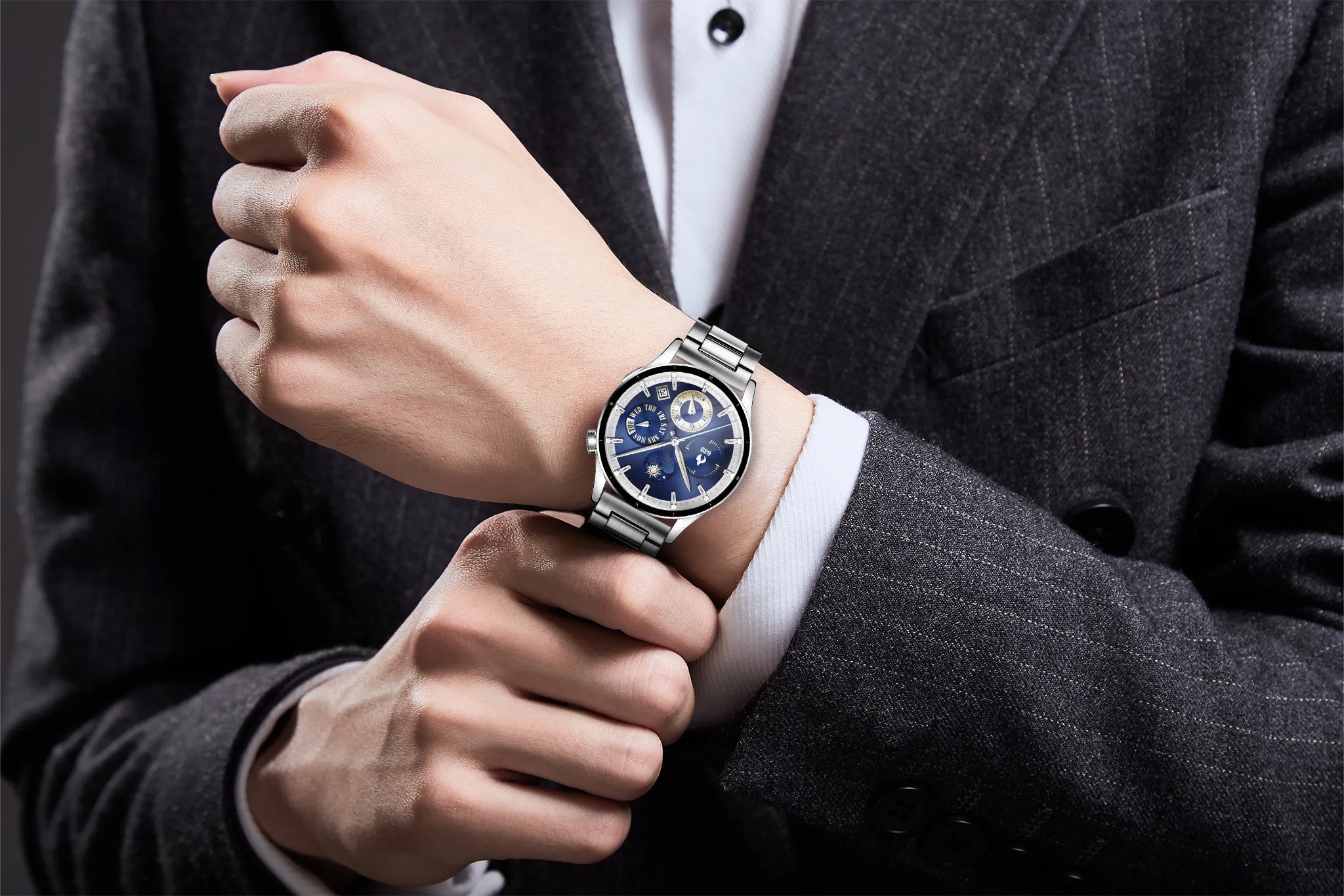 1.32インチのスマートウォッチ、iPhone/Android対応、Bluetooth5.3、通知/通話機能、タッチサファイアガラス、回転式クラウン、ビジネスメンズ、IP67防水、長持ちバッテリー、文字盤設定、70種類運動モード、付属ベルト*2本