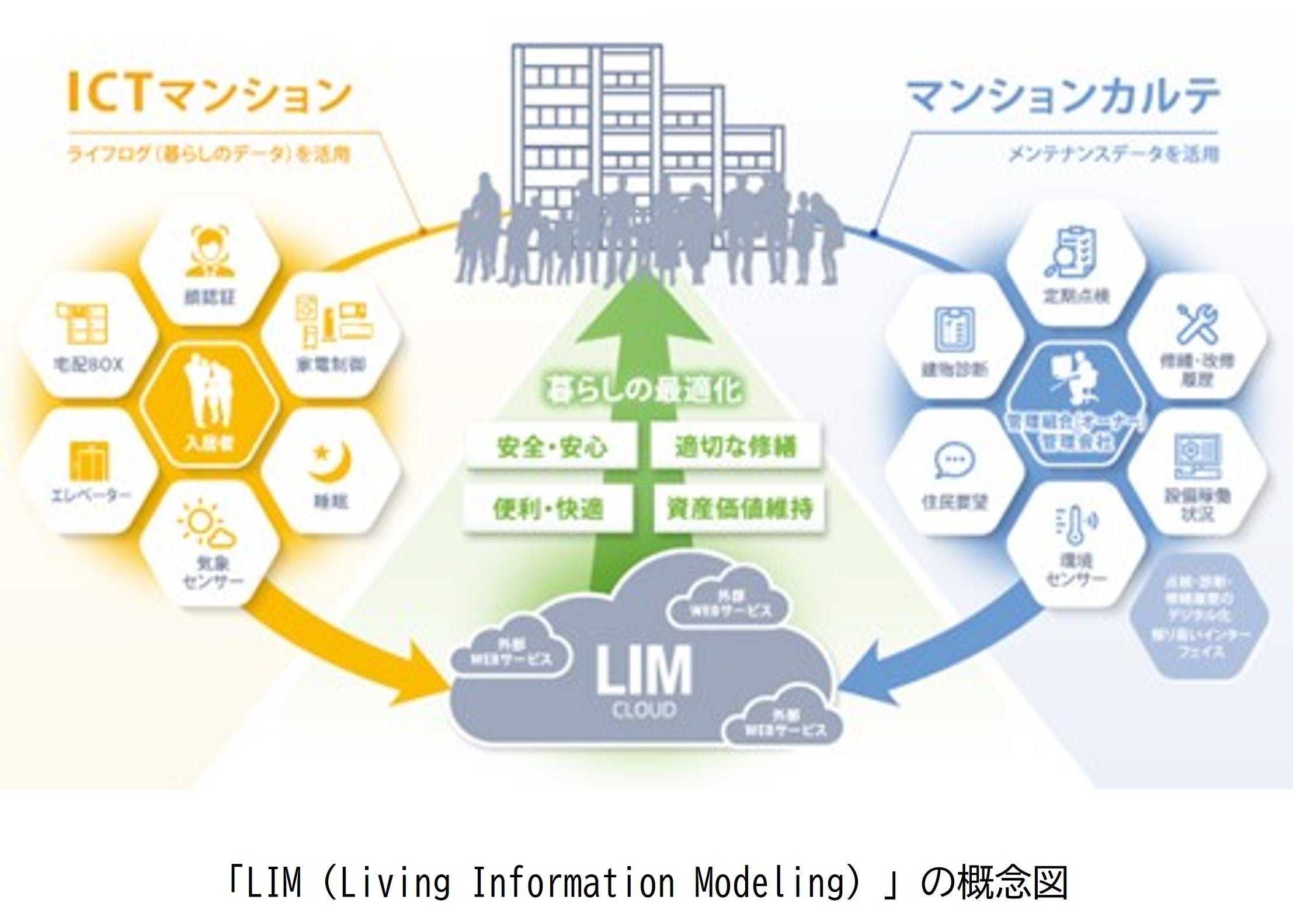 長谷工では、「ICTマンション」に設置した認証設備や各種センサー等によって得られた住まう方のライフログや、「マンションカルテ」に登録された建物・設備のメンテナンスデータなどを活用し、暮らしを最適化する概念を「LIM(Living Information Modeling)」と呼んでいます。そして、それらのデータを収集・分析するプラットフォーム「LIM Cloud」を開発しています。※3