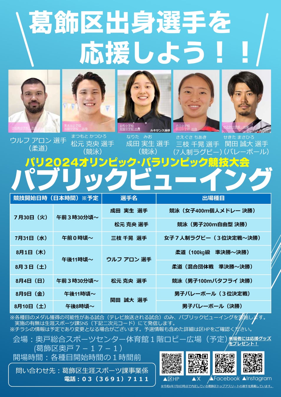 葛飾区出身のウルフアロン選手が出場する柔道100キロ級の準決勝・決勝の試合を、葛飾区奥戸の