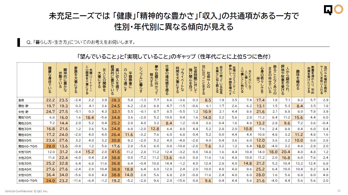 また、性別・年代別に上位5つの未充足ニーズを比較すると、いずれの属性においても「精神的に豊かな状態でいる」「高い収入を得て経済的に豊かでいる」の2項目が共通していました。