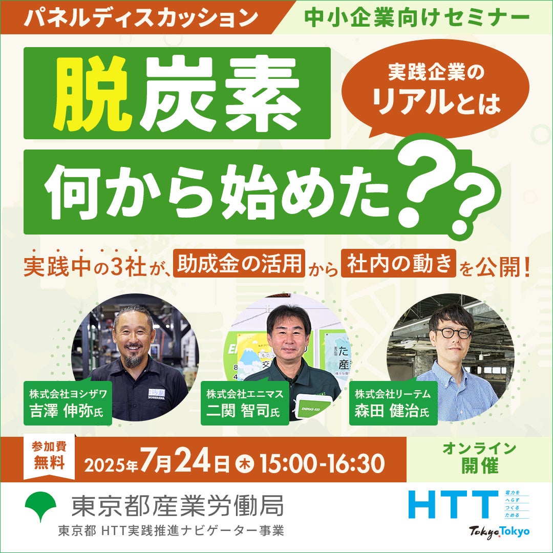 GX推進法の改定や2035年の新たな中間目標の決定など、脱炭素社会の実現に向けた国内の枠組みがますます強化されていく中で、持続可能な成長を目指す中小企業にとっても、いまや脱炭素経営は取り組むべき喫緊の課題となっています。本セミナーでは、様々な課題を乗り越えて果敢に脱炭素経営に取り組まれている先進中小企業3社をお招きし、パネルディスカッション形式で取組の詳細をご紹介します。