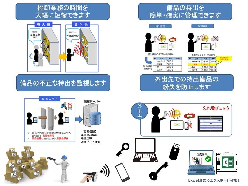 備品の貸出・返却を行う際は、物品に貼り付けたRFIDタグをハンディーリーダーで一括読み取りして、持ち出し・返却台帳を瞬時に作成することができ、「いつ」「誰が」「何を」持ち出したか?を、的確に管理可能です。情報の一元管理により、漏れや紛失を防止します。