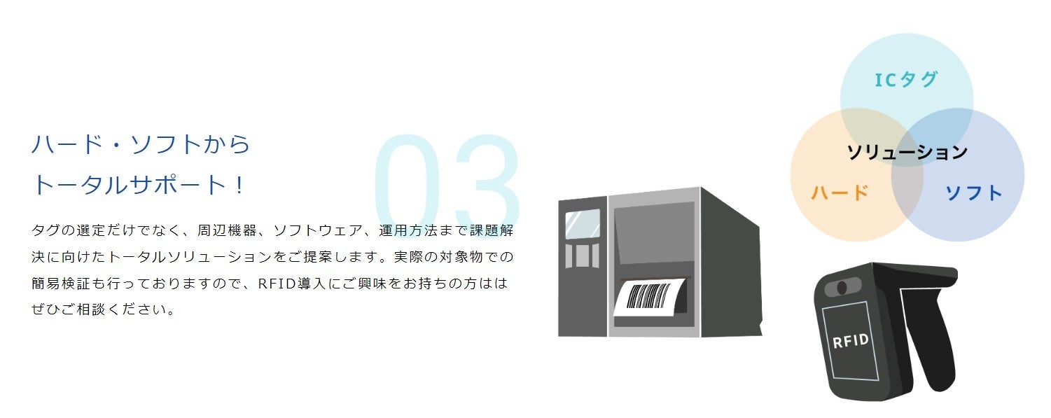 両社は、幅広い分野の企業様だけでなく、自治体などの行政サービス、学校法人などの文教分野にいたるまで、幅広く「人件費削減・社内DX化・ペーパーレス化」をサポートします。また、取付対象物や管理方法等ヒアリングした上で、最適なRFIDタグをご提案します。
