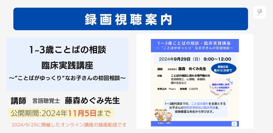 2024年9月29日、一般社団法人ことばサポートネットは、幼児のことばの相談に対応する専門職を対象にオンライン講座『1〜3歳ことばの相談・臨床実践講座』を開催いたしました。