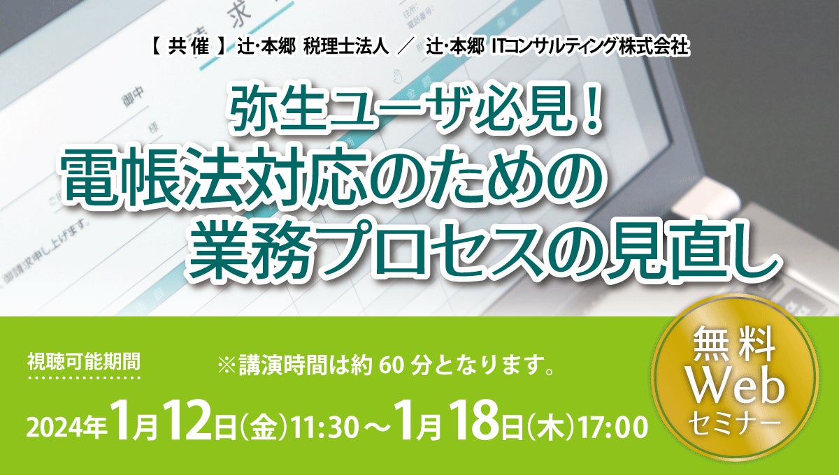 辻・本郷 税理士法人(本社:東京都新宿区、理事長:徳田孝司)と辻・本郷 ITコンサルティング株式会社(本社:東京都渋谷区、代表取締役:黒仁田健)は共催で、2024年1月12日(金)より「弥生ユーザ必見! 電帳法対応のための業務プロセスの見直し」セミナー開催いたします。本セミナーでは、弥生会計ユーザー様向けの電帳法対応方法を、実際の画面を使って解説いただきます。そして、システム導入のために必要な、業務フローの見直し方も解説します。
