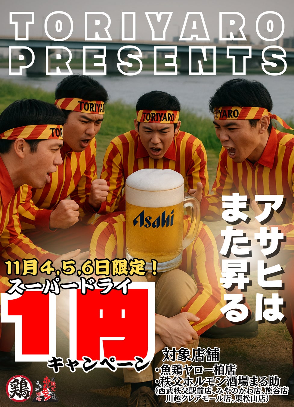 【鶏ヤロー×秩父ホルモンまる助×アサヒビール】 “今だからこそ” 応援企画!アサヒビール何杯でも1円キャンペーン開催!