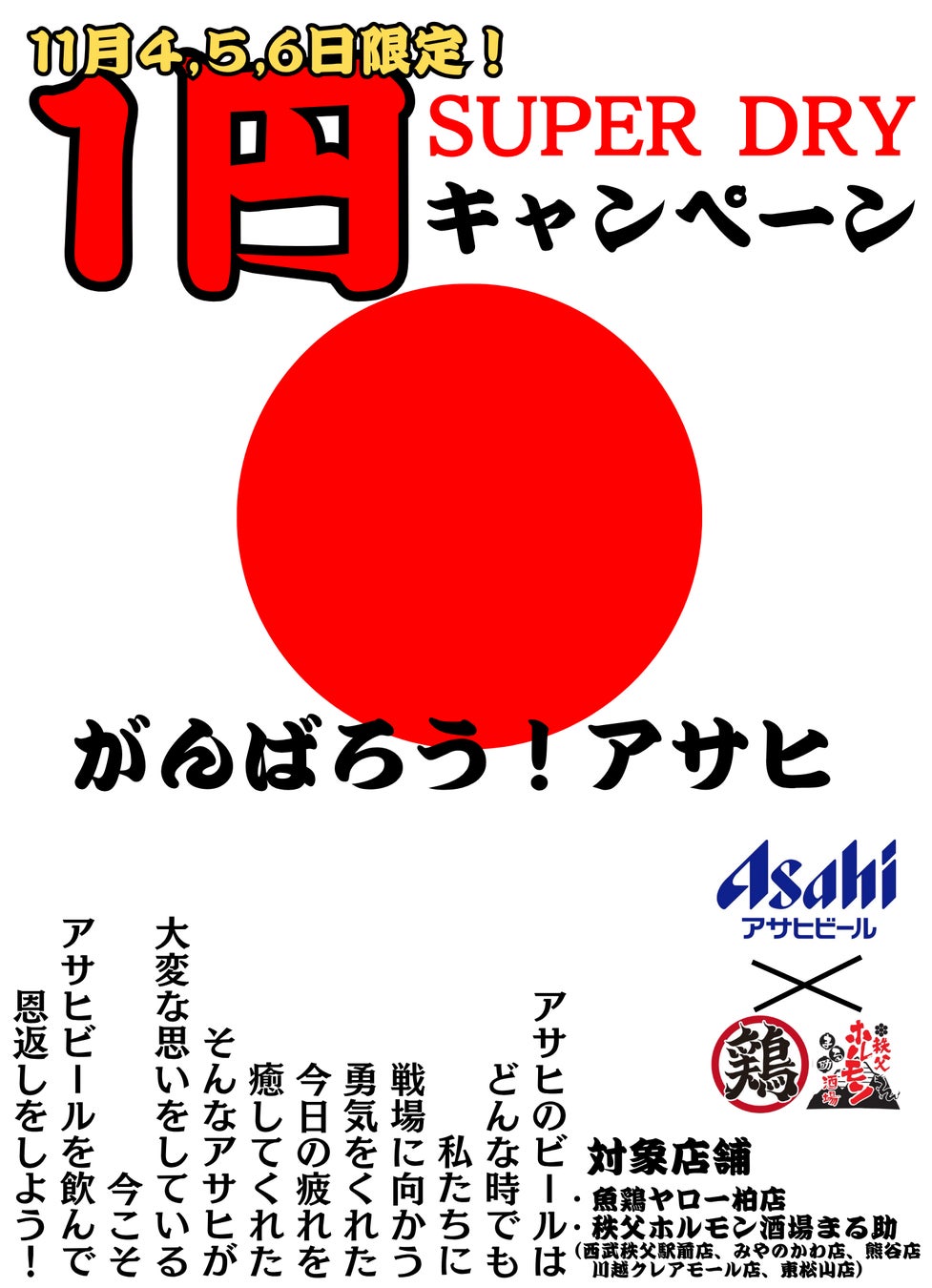 企画名:鶏ヤロー×秩父ホルモンまる助×アサヒビール 応援企画「何杯でも1円」キャンペーン