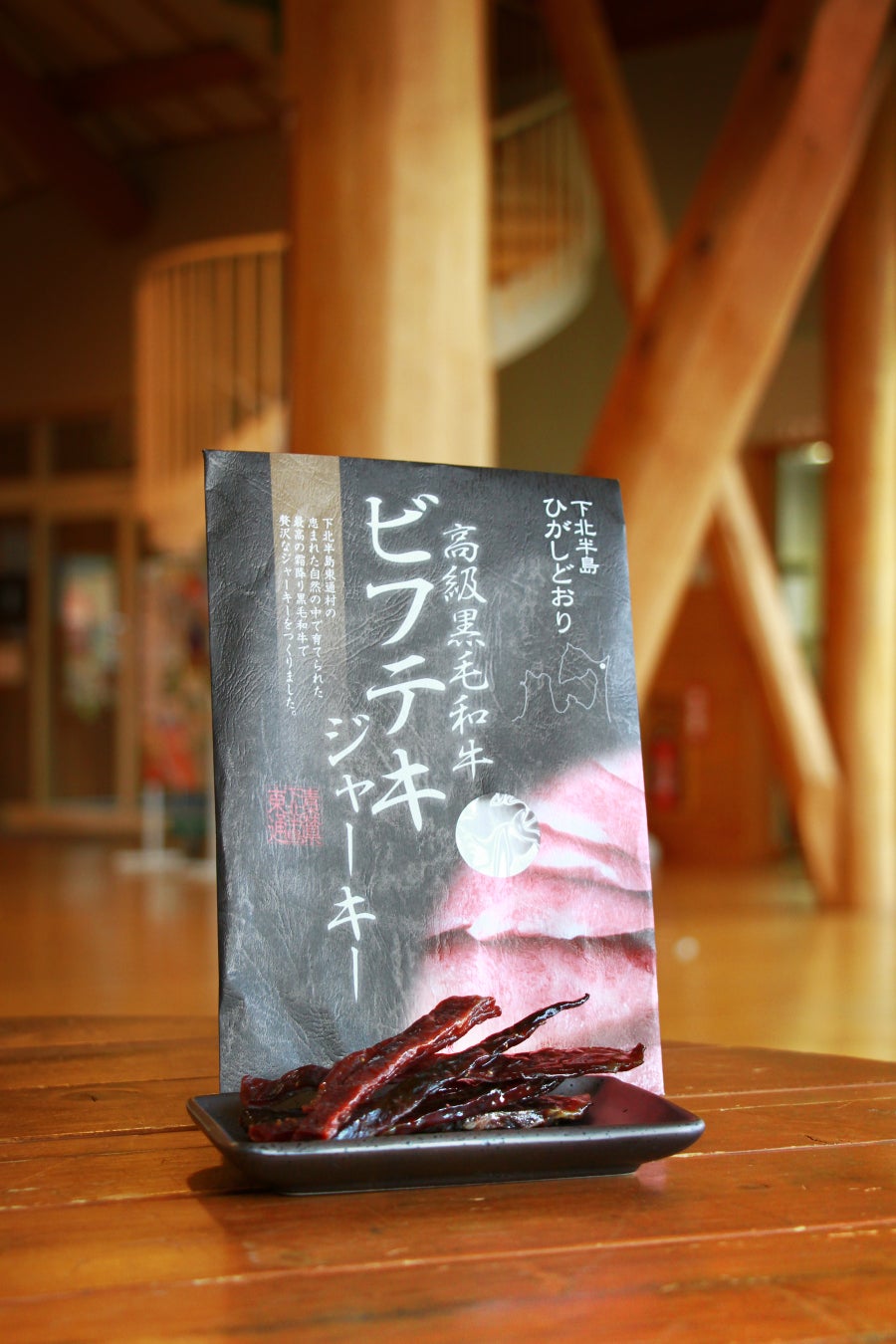 東通牛のモモ肉をじっくり加熱乾燥した、極上やわらかビフテキジャーキーです。