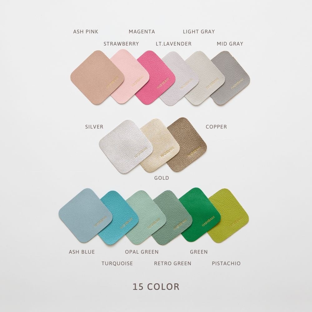 左から アッシュピンク/ストロベリー/マゼンタ/ライトラベンダー/ライトグレー/ミッドグレー/シルバー/ゴールド/コッパー/アッシュブルー/ターコイズ/オパールグリーン/レトログリーン/グリーン/ピスタチオ