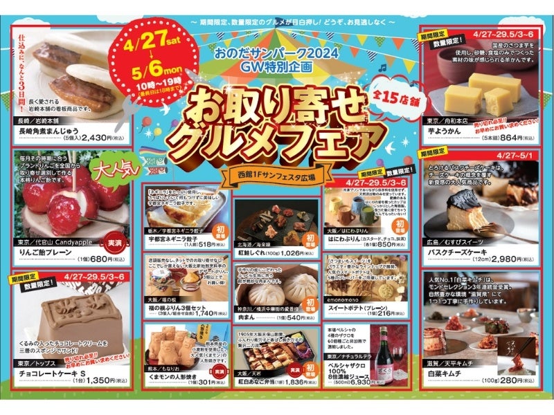 山口県を拠点に展開する富士商グループ(本社:山口県山陽小野田市稲荷町10-23 代表取締役:藤田 敏彦)の小野田商業開発株式会社が運営をおこなう複合商業施設「おのだサンパーク」は、2024年4月27日から5月6日まで、グルメイベント「おのだサンパーク2024GW【お取り寄せグルメフェア】」を開催いたします。この10日間、ご来場の皆さまへ全国から集まる絶品グルメを存分にお届けいたします。