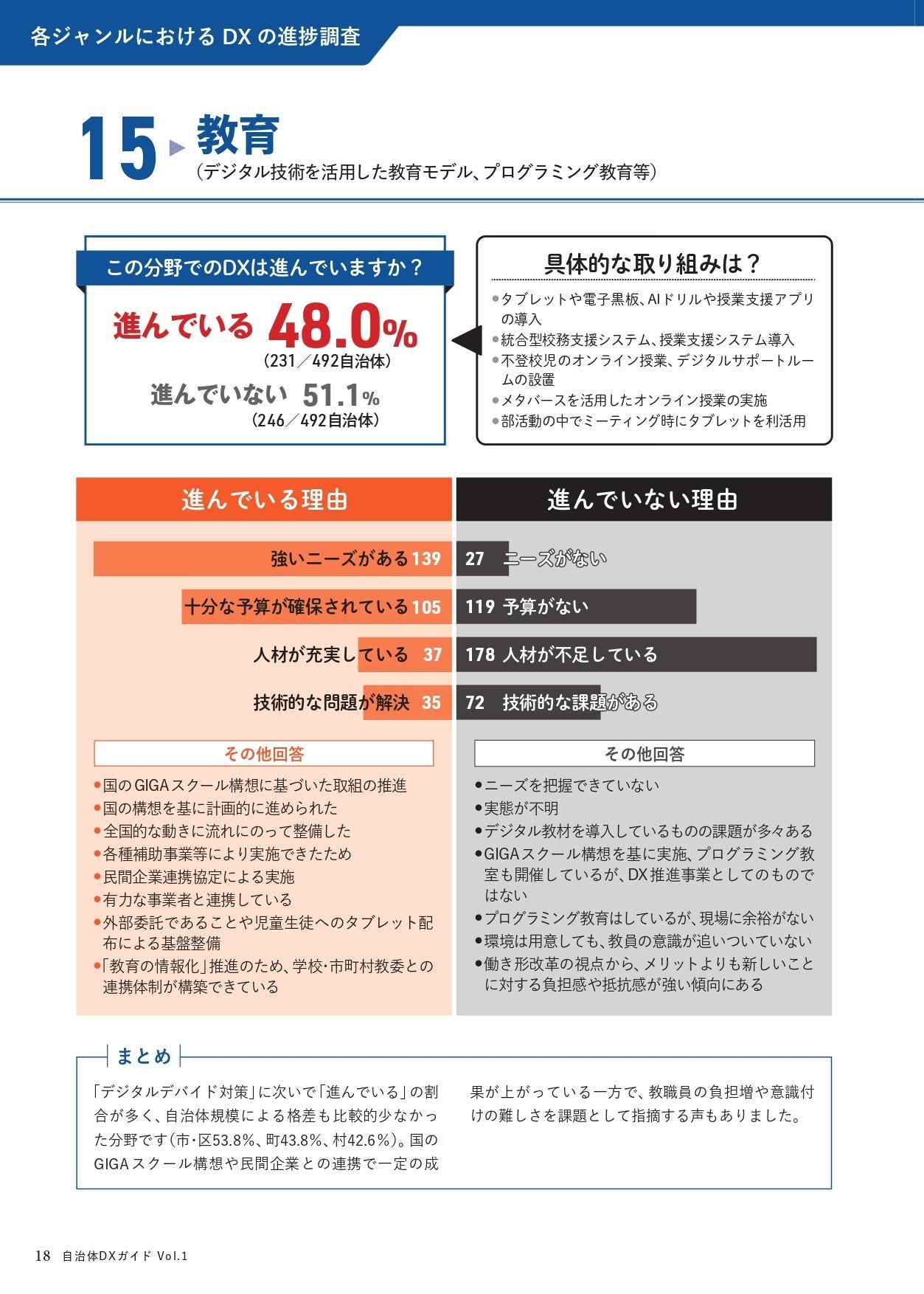 しかし、進んでいない自治体は51.1%に上り、ニーズの不明確さ、教員のデジタル技術への抵抗感、プログラミング教育の導入にもかかわらず現場に余裕がないなどの課題が指摘されています。