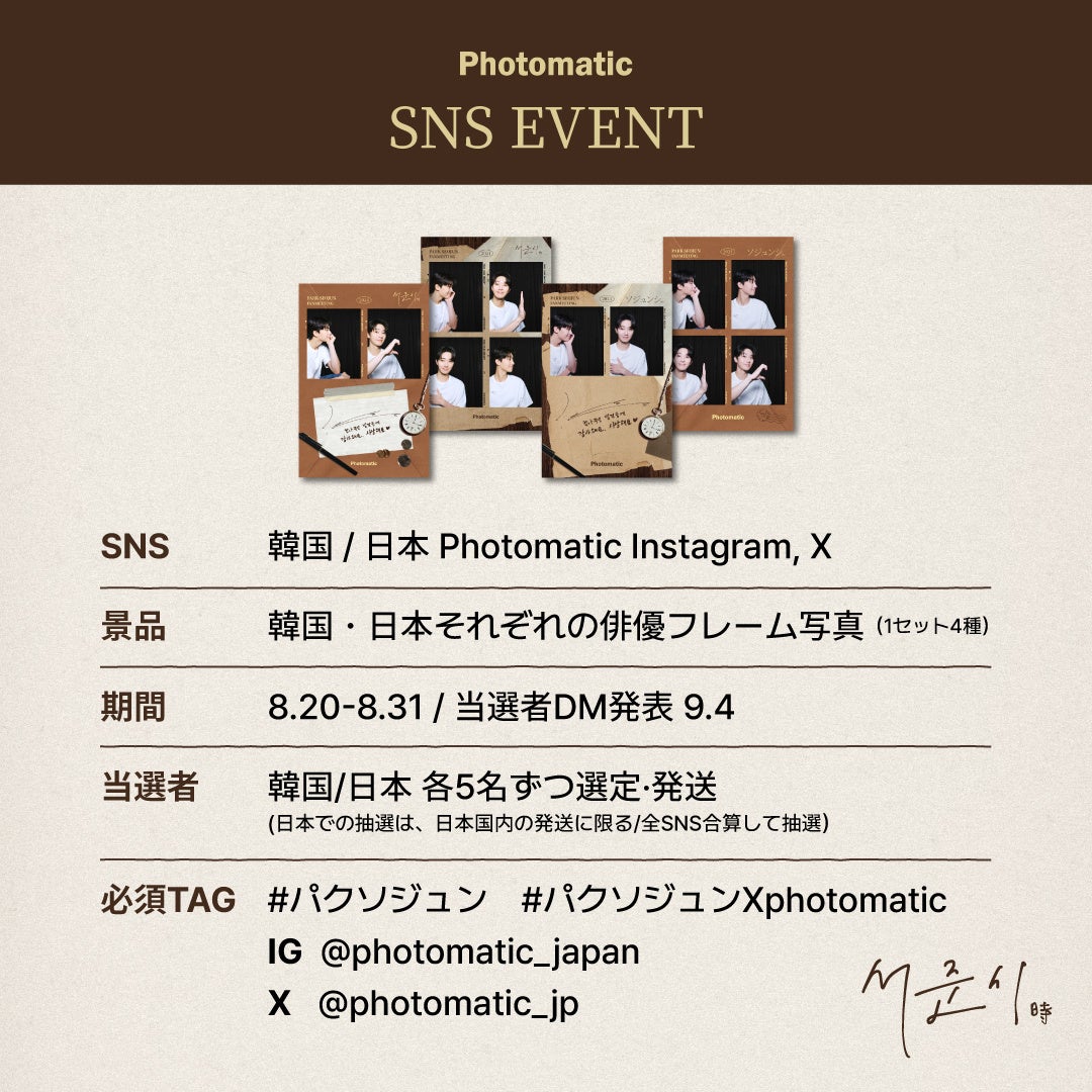 上記期間中に、XまたはInstagramで、Photomatic日本公式アカウントをメンションし、「#パクソジュン」と「#パクソジュンxPhotomatic」 のハッシュタグを付けて投稿してください。