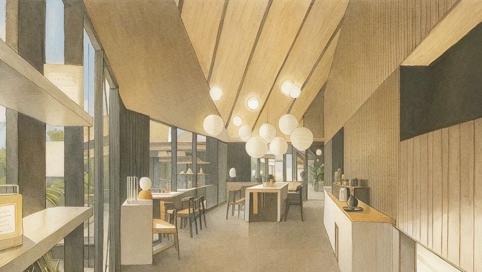 設計においては、伝統的な町並みとの調和を大切にしながらも、新たな視点を取り入れ、町に新しい風を吹き込むことを意図しています。周辺環境に呼応する屋根の配置と、あえて斜めにレイアウトされたカフェ・ワークショップ棟の構成により、敷地内に緩やかな余白と溜まりの空間を創出。人々が自然と集まり、交流が生まれる場所としても機能します。