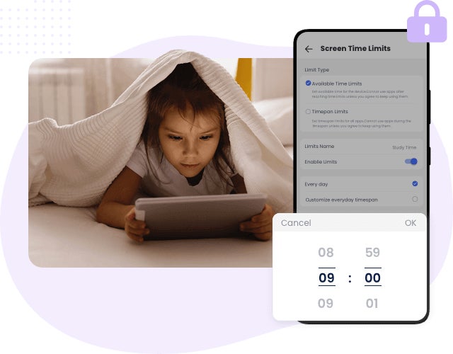 AirDroid Parental Controlのスクリーンタイム制限機能を利用することで、お子様のアプリ/デバイス使用に1日の上限を設定して健康な習慣を促しましょう。1日の上限に達すると、デバイスは自動的にロックされます。