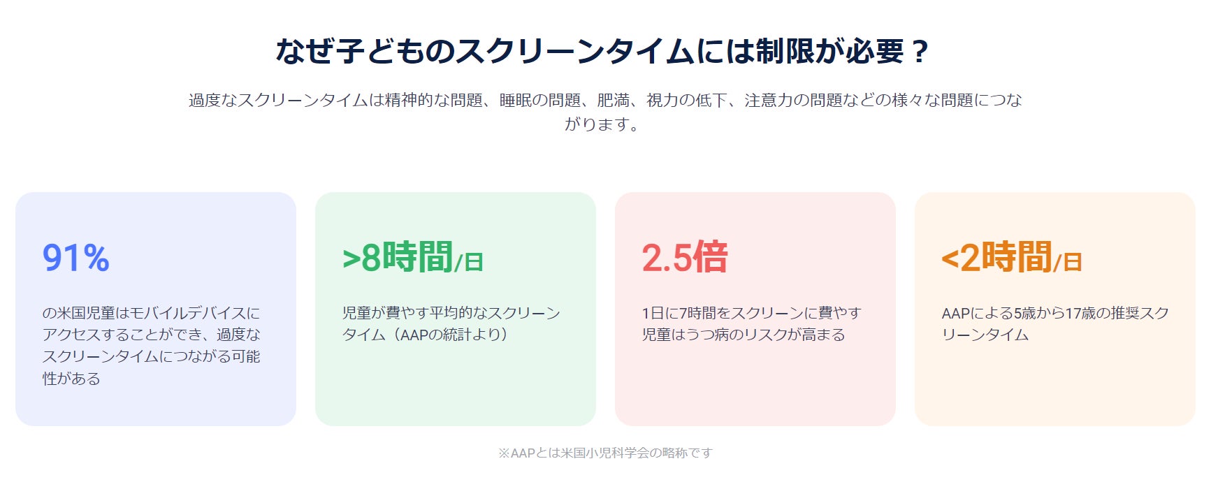 過度なスクリーンタイムは精神的な問題、睡眠の問題、肥満、視力の低下、注意力の問題などの様々な問題につながります。