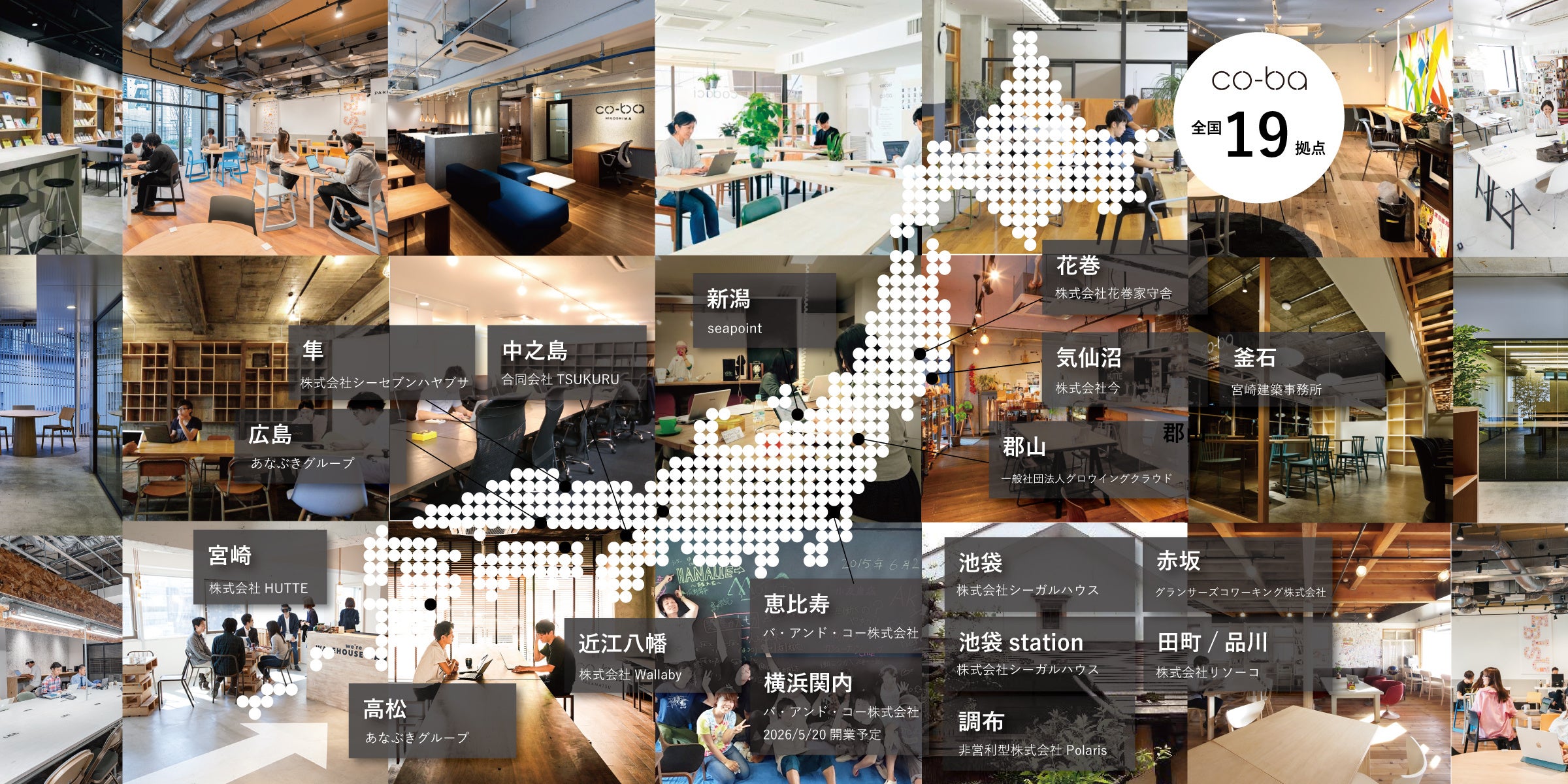 co-baは2011年11月、東京・渋谷に第1号拠点を開設して以来、「会員同士が応援し合うコミュニティ」を核に据えたコワーキング&シェアオフィスの運営を続けてきました。2023年11月にBa&Coが事業を承継し、現在は直営1拠点(恵比寿)、全国パートナーシップ18拠点を展開しています。2026年5月20日には横浜・関内に新拠点「co-ba横浜関内」の開設を予定しており、直営2拠点体制へと拡大します。