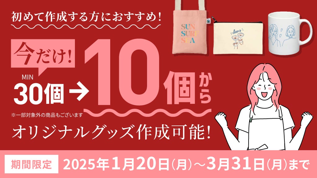 株式会社トランス(本社:東京都渋谷区、代表:猪口 祐紀子)が運営するグッズ製作ECサイト『オリジナルグッズドットコム』は、期間限定で最小10個からオリジナルグッズが作成できるキャンペーンを2025年1月20日(月)より開始いたしました。