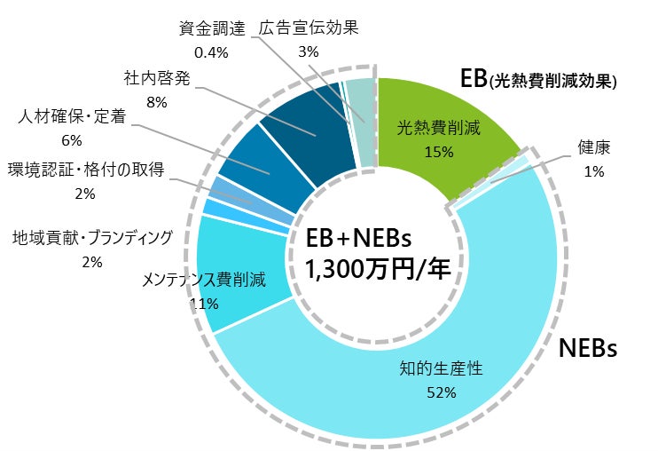 算定の結果、EB・NEBs効果額は合計約1,300万円/年、うちNEBs効果額は約1,100万円/年と推計されました。