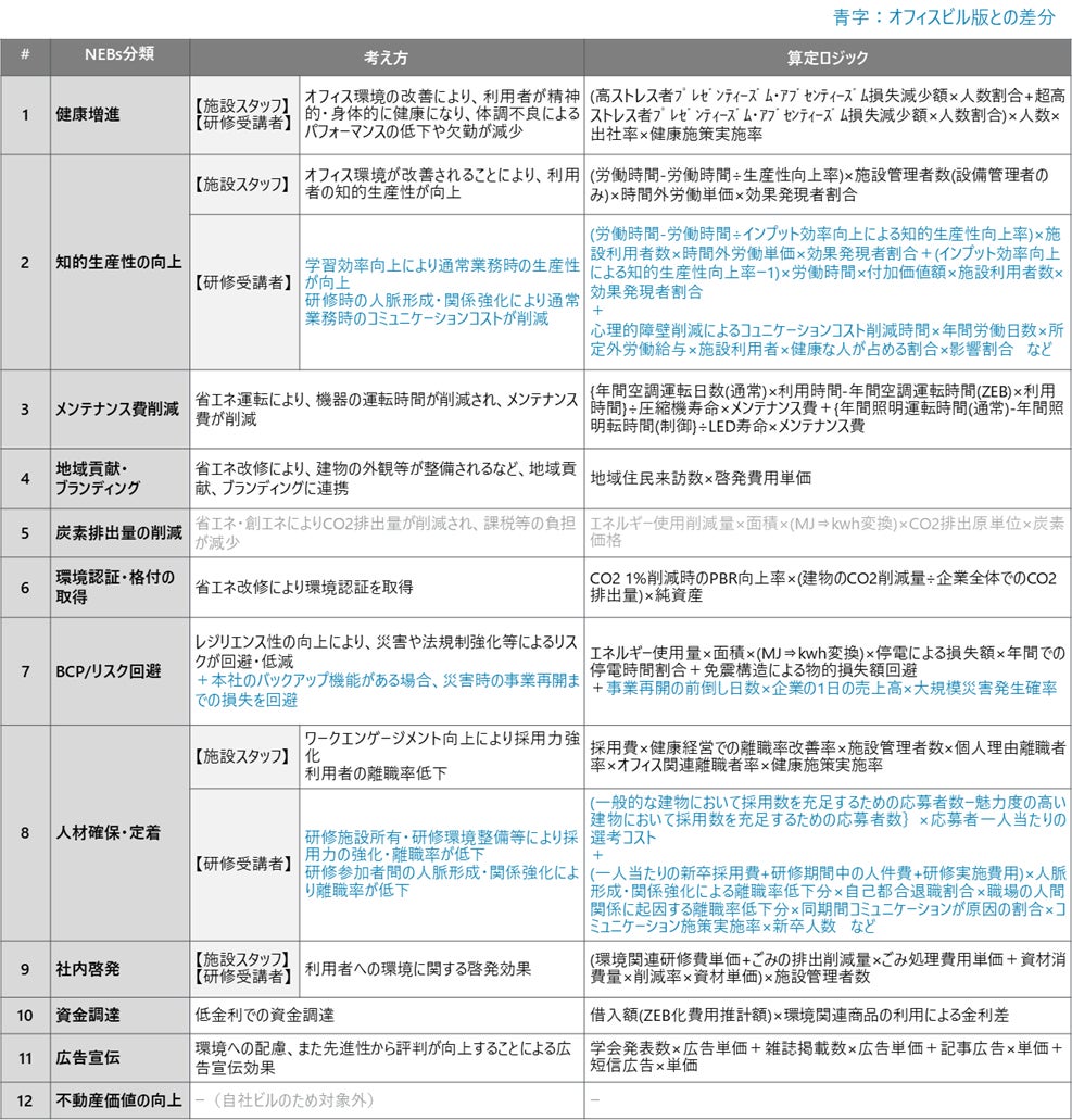 既存の自社所有の事務所ビルを対象とした12項目のNEBs指標をベースに、企業の教育・研修施設において発現するベネフィットを整理しました。また、それらのベネフィットを定量化するロジックを作成し、整理しました。