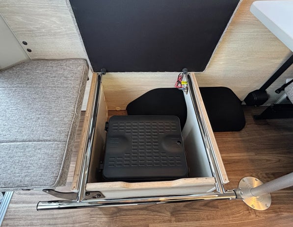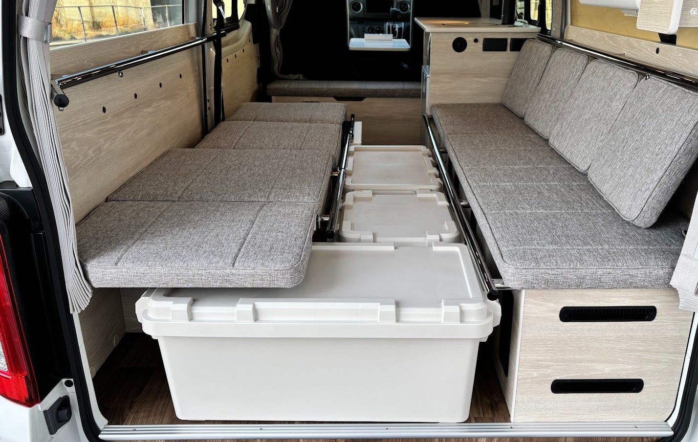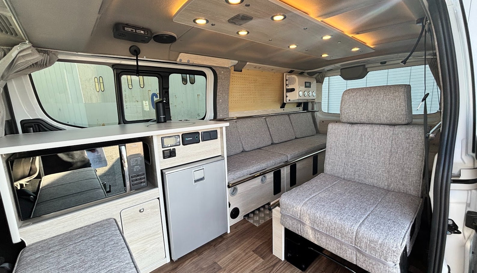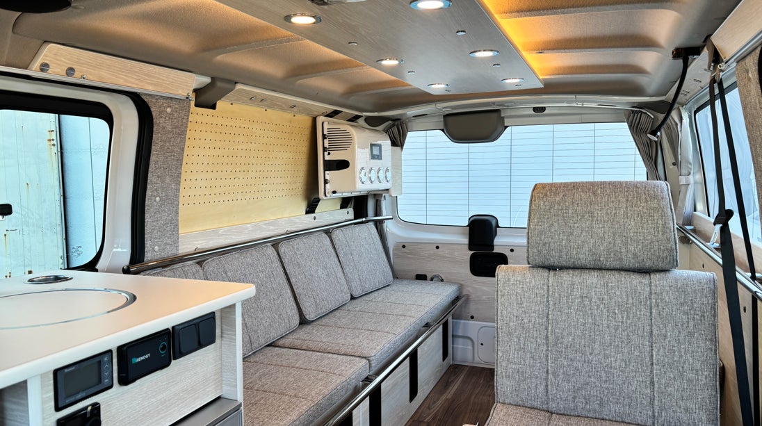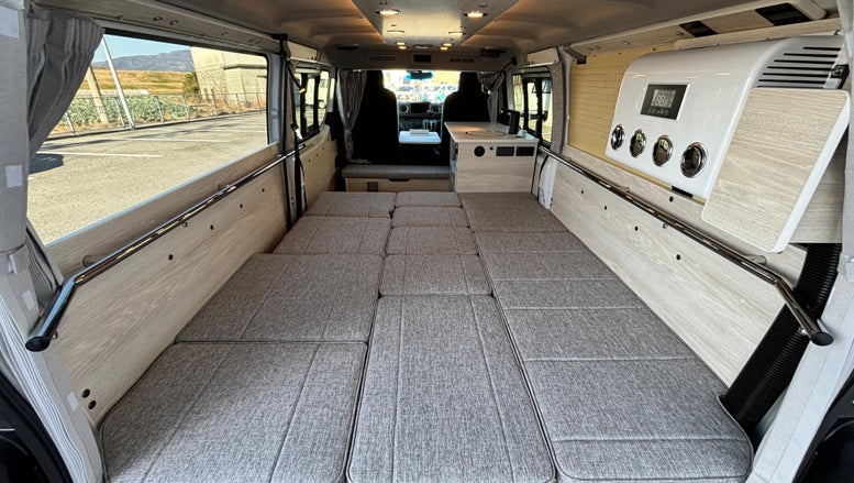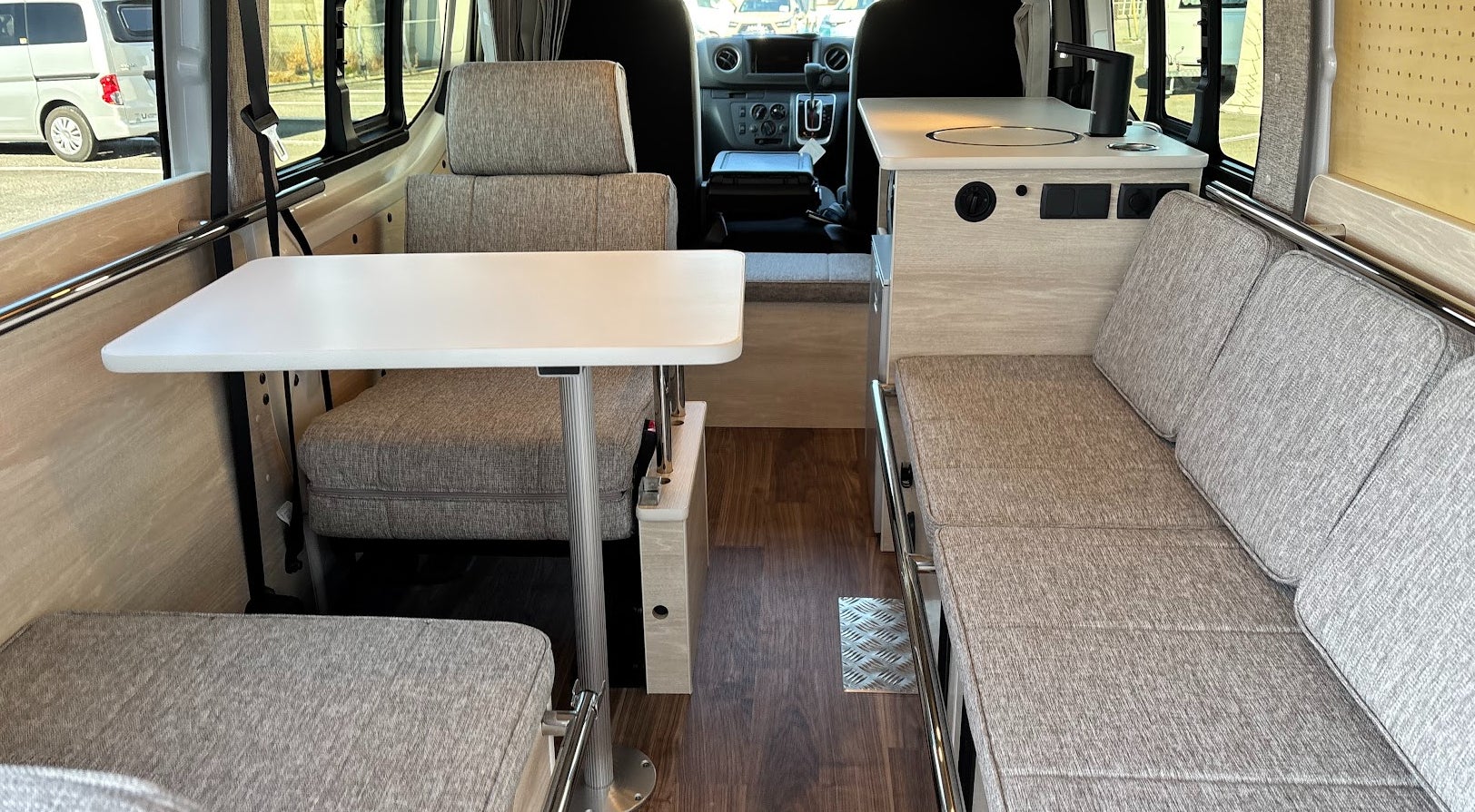 エントランス後方に前向き、後向き、フラットモードになる1人掛けマルチシートが設置されています。ひじ掛けも付いて快適に乗車できます。横向きの3人掛けシートは2点式シートベルト付。すべてのシートをフラットにすれば大人2人と子供1人が就寝できる広々としたスペース(最大長さ1900mm×最大幅1500mm)に早変わりします。ポール式テーブルは走行時・停車時ともに簡単に設置位置を移動できて大変便利な仕様となっています。