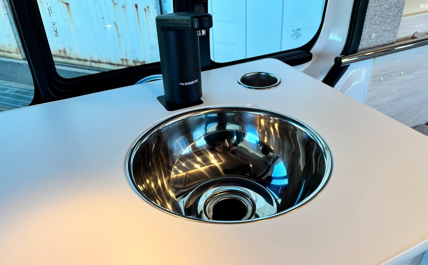 丸型シンクには蓋がついており、使用しない時はスペースを広く有効活用できます。マグネット式ポータブルウォータータップは取り外し可能で屋外で使用することもできます。調理カウンター下には49L冷蔵庫と電子レンジ、収納スペース、清水タンク・排水タンク(各12L)を完備し、料理しやすい環境を整えました。