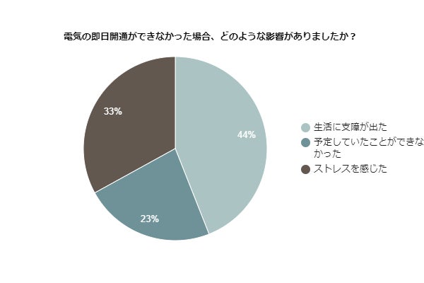 「電気の即日開通ができなかった場合、どのような影響がありましたか?」という質問に対して、44%の人が「生活に支障が出た」と回答しました。