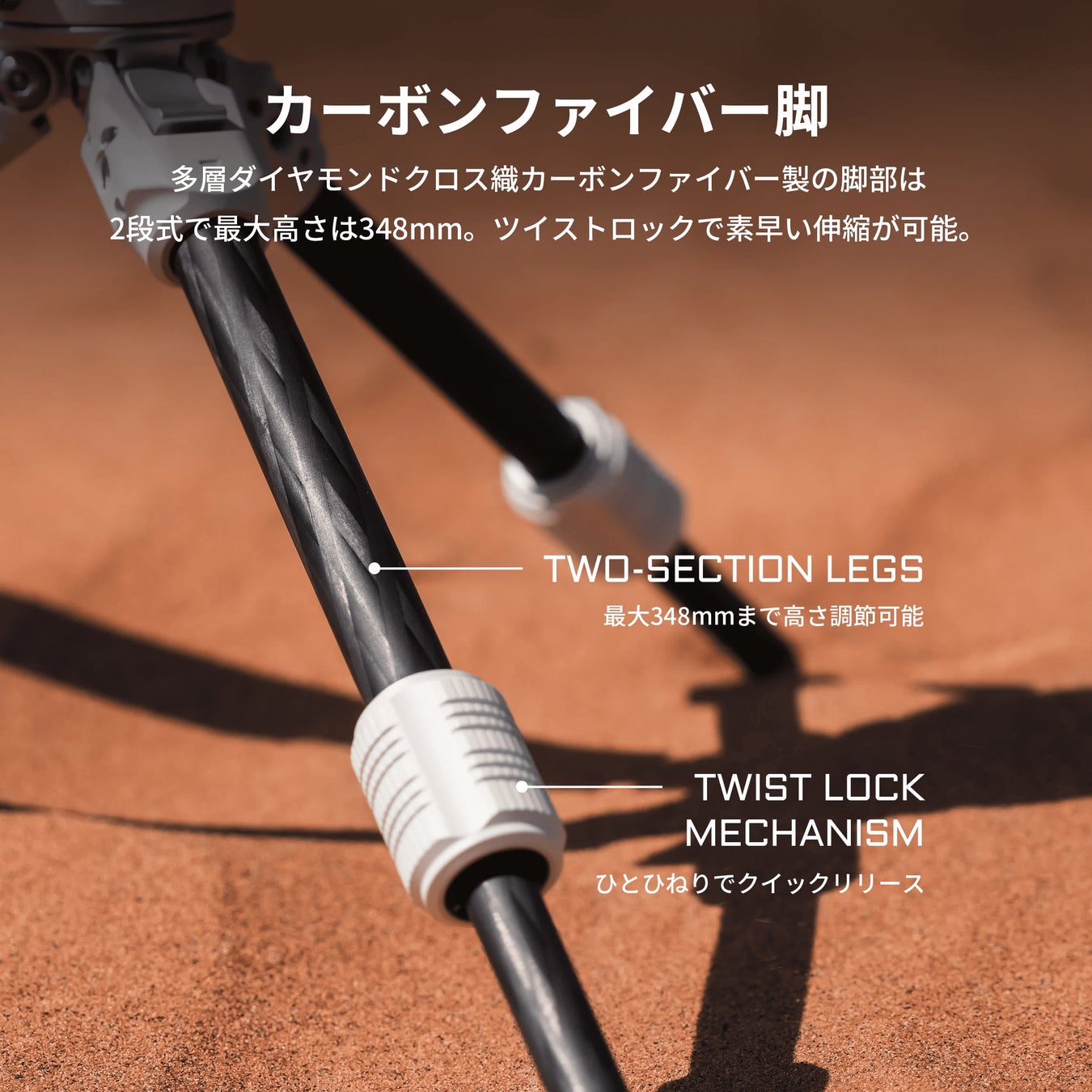 一体型のレベリングボウル付きで簡単にバランス調整できる、スムーズな操作性でプロフェッショナルな仕上がりを実現可能でカーボンファイバー脚が搭載されて2段階で最大348mmを伸縮を対応、収納時高さは282mmとコンパクトでカメラバッグやバックパックに収納可能