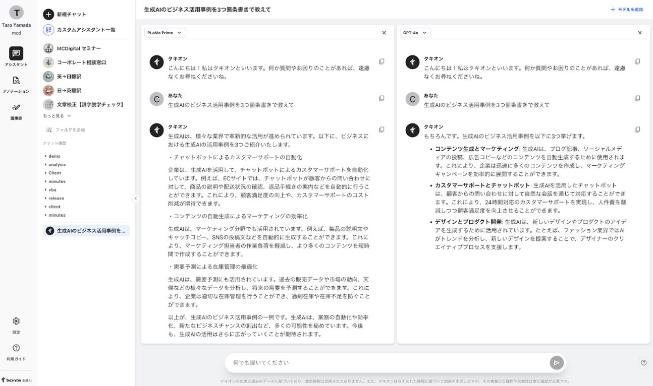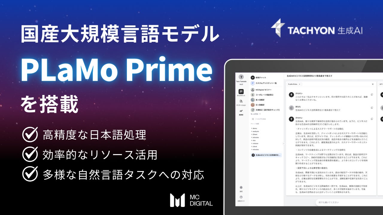 テクノロジーをもって企業の課題解決を支援するエムシーデジタル株式会社(本社:東京都千代田区、代表取締役社長:河内 伸学)は、GPT/Gemini/Claudeの複数LLM利用が可能な法人向け生成AIサービス「Tachyon(タキオン) 生成AI」において、株式会社Preferred Networksの子会社である株式会社Preferred Elements(本社:東京都千代田区、代表:岡野原 大輔)社製の国産大規模言語モデル「PLaMo」のフラッグシップモデル「PLaMo Prime」を搭載しました。