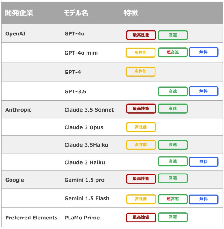 「Tachyon 生成AI」では、今回搭載された「PlaMo Prime」の他、OpenAI社が開発するLLM「GPT」、Google社開発「Gemini」、Anthropic社開発「Claude 3/3.5」を搭載しています。現在、以下11個のモデルをご利用いただけます。
