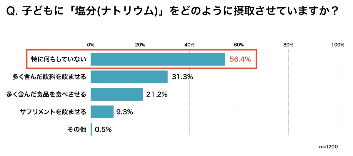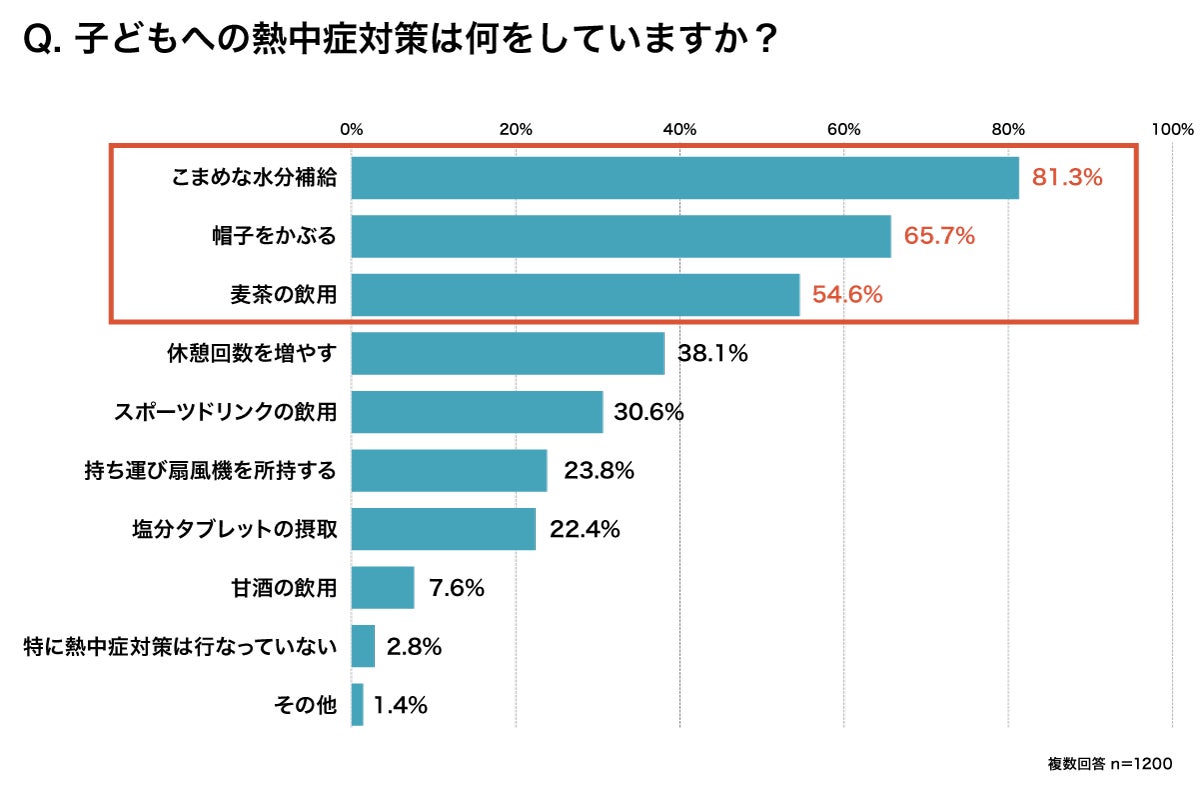 熱中症対策として「こまめな水分補給」(81.3%)をしている人が最も多く、「帽子をかぶる」「麦茶を飲む」との回答が続いた。一方、「こまめな水分補給」をしていても「塩分(ナトリウム)を与えていない人」が、約6割(56.4%)だった。