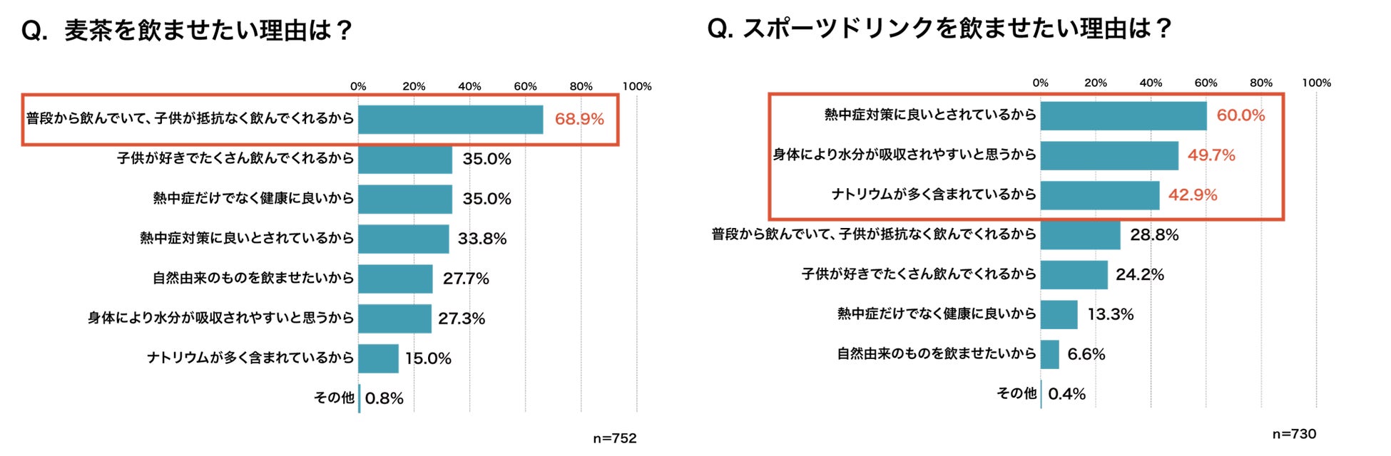 麦茶は子どもが「普段から飲み慣れていて抵抗なく飲んでくれる」(62.7%)という理由で選ぶ人が多い結果に。熱中症対策に「塩分(ナトリウム)の摂取が良い」という知識を持っていても実際には与えていない人の多さが目立った。その背景には親としては子どもが口にするものはなるべく身体に優しいものを選びたいという心理が働いている可能性も。