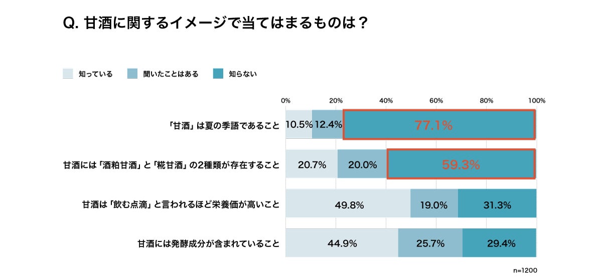 甘酒に関しては8割近くの人が「冬」のイメージを持っているが、「夏の季語」であり江戸時代には庶民の栄養ドリンクとして甘酒屋が売り歩いている光景が夏の風物詩だった。また、約7割の人がアルコールを含む「酒粕甘酒」と、米と糀からできる「糀甘酒」の2種類があることを知らなかった。