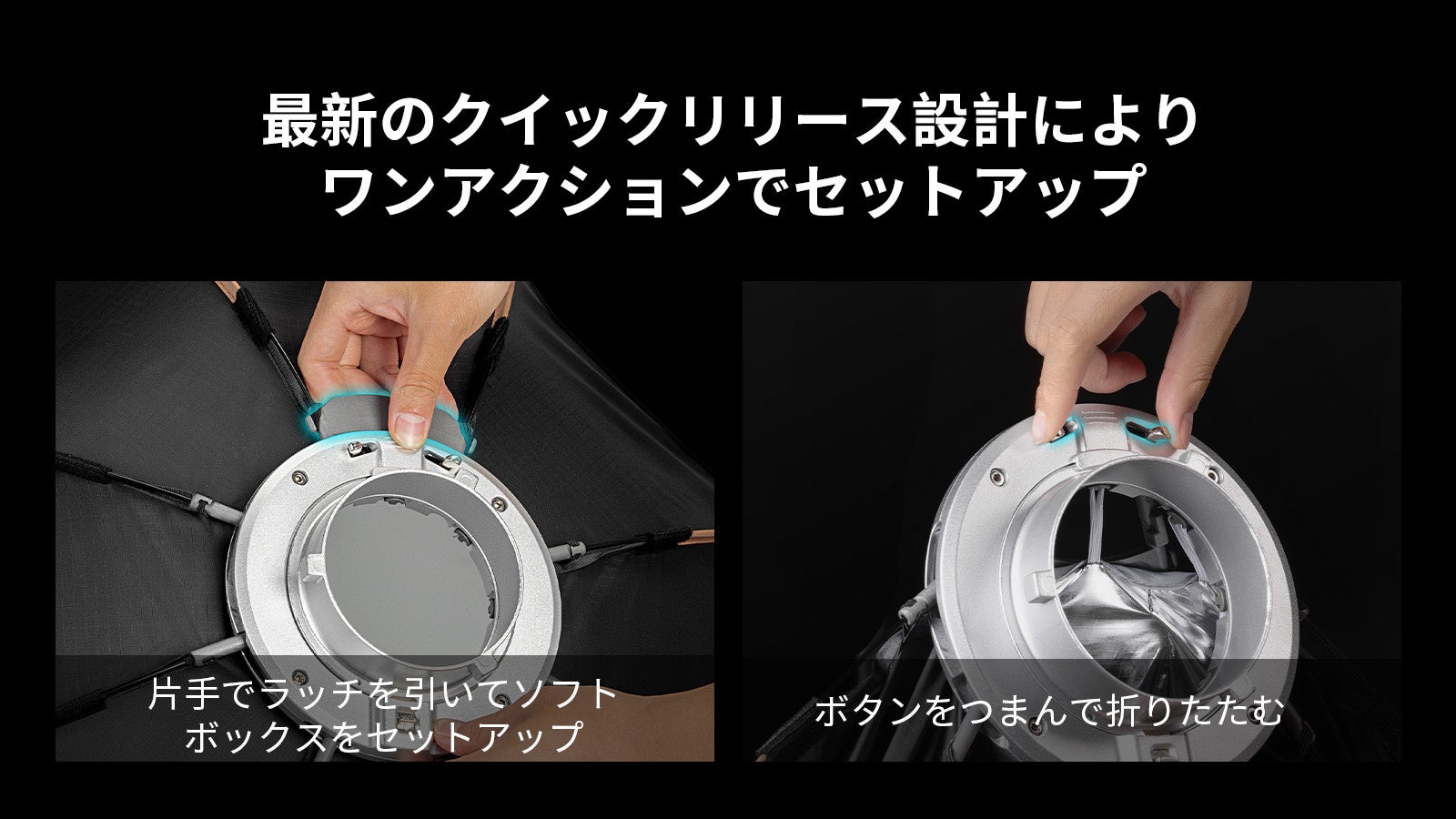 LA-O90八角形ソフトボックス4633は最新のクイックリリース設計を採用し、ワンアクションで開閉することができます。片手だけでラッチを引くとソフトボックスをセットアップでき、ボタンをつまむと折りたたむことができます。