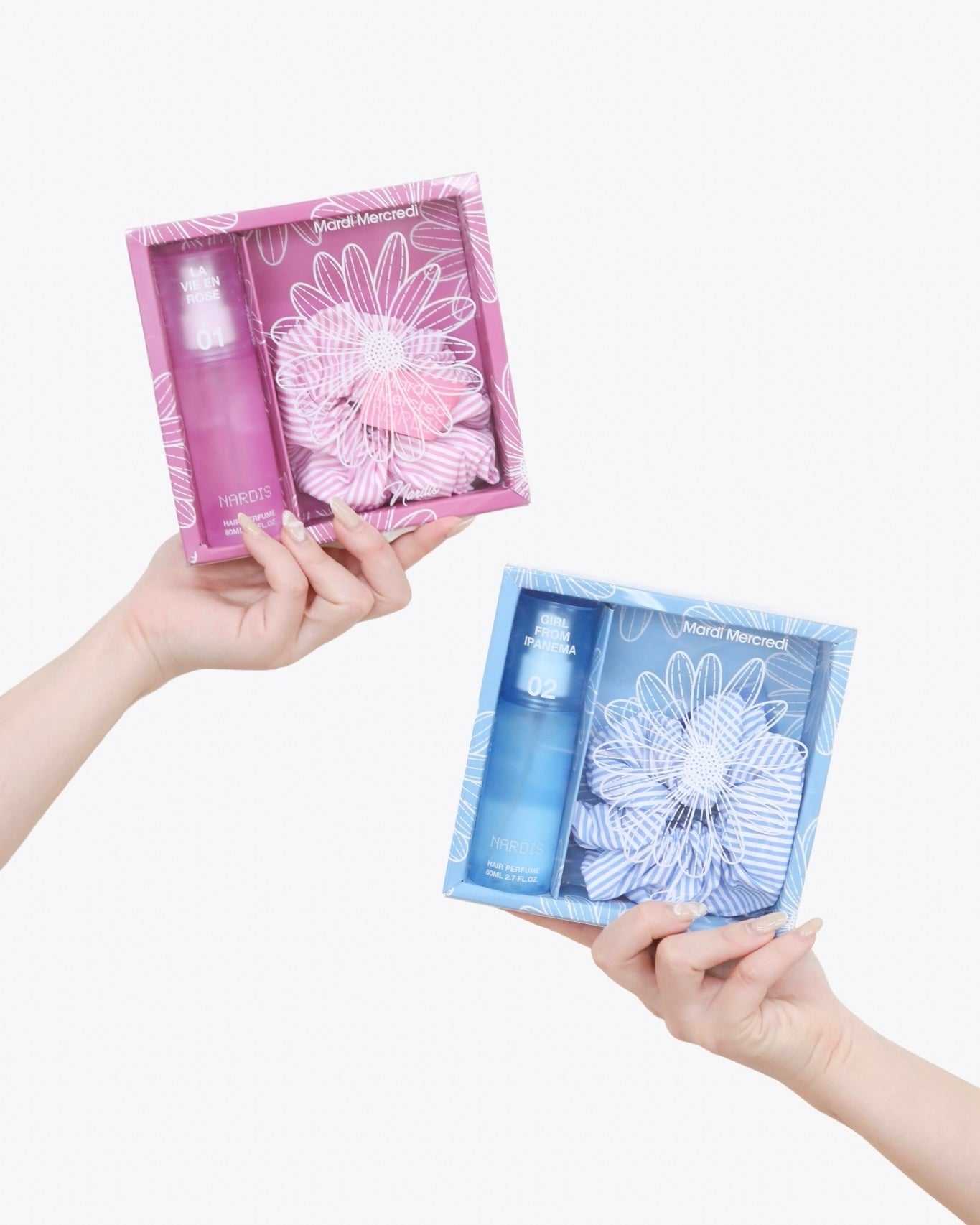 フラワーマルディがあしらわれたボックスに、オリジナルタグ付きのシュシュとヘアフレグランスがセットになった限定アイテム。