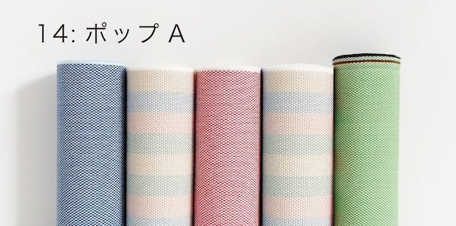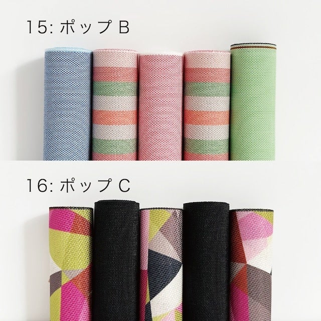 一般的な柄の「伝統模様(2種類)」のほか、従来の畳のイメージを覆す「ポップ(9種類)」、使い勝手の良い「無地(2種類)」の3つのテイストでラインナップを展開しており、畳縁のデザインの自由さ・面白さを伝える商品となっています。