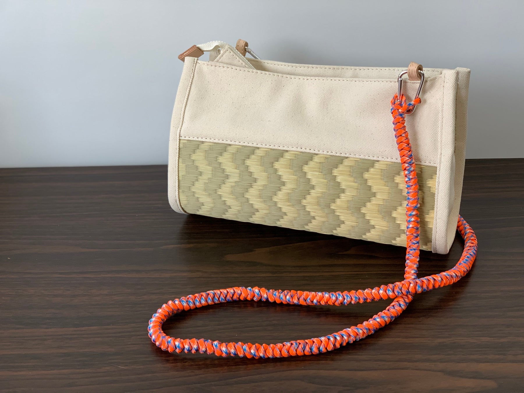 天然イグサの畳表と、デニム生地や帆布を組み合わせたクラッチバッグ。500mlのペットボトルが入る大きさで収納力に優れ、性別や年齢を問わず使いやすいシンプルなデザインとなっています。手持ちでクラッチバッグとして利用できるほか、肩掛けや斜めがけのバッグとして使える紐を用意。紐には耐久性があるパラコードを使用しており全6色から選べます。