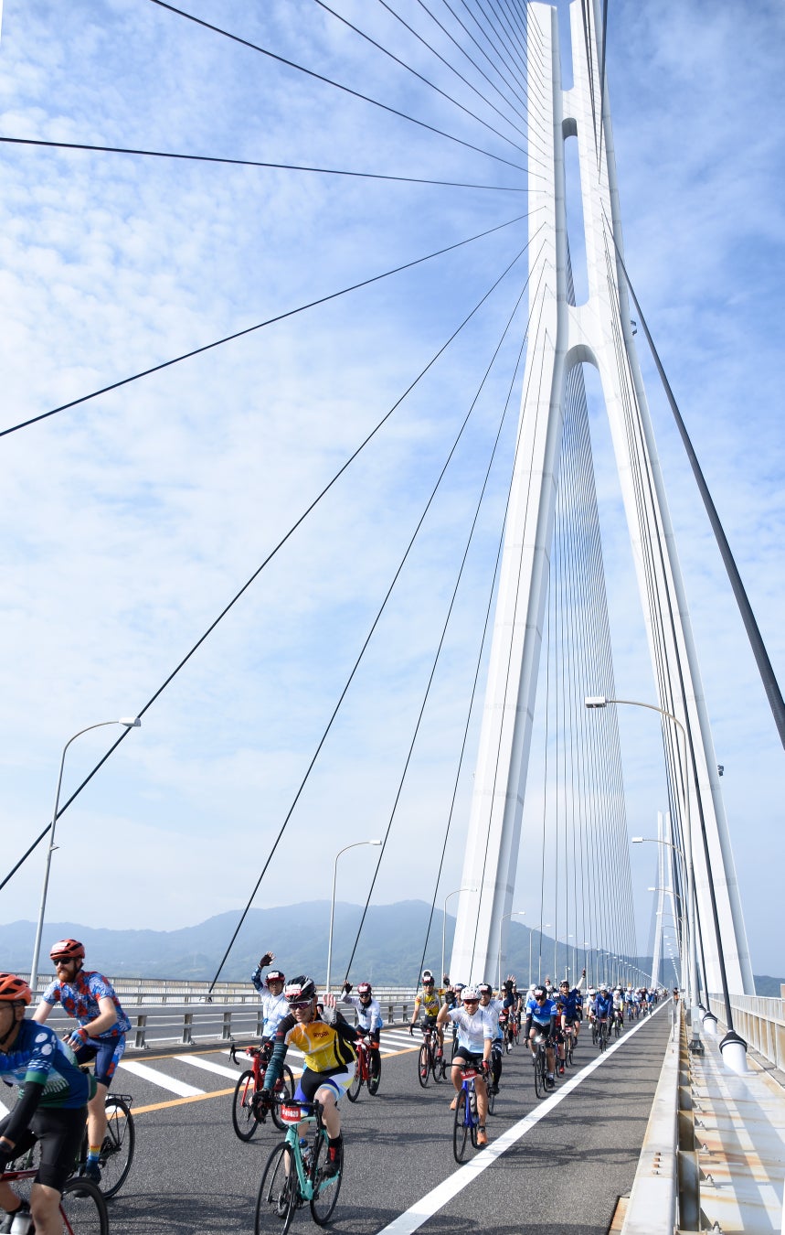 10月27日の2024大会では、初心者やファミリーで楽しめる40kmのライドから瀬戸内海を縦断する140kmの今治・尾道往復コースまで、幅広いレベルの人が楽しめる全8コースを設定。全国すべての都道府県と27の国・地域から訪れた3,446人の参加者には、高速道路上をサイクリングする開放感に魅せられたリピーターも数多くみられ、橋上での爽快さに思わず「サイコー!」と声をあげながら走る姿がありました。