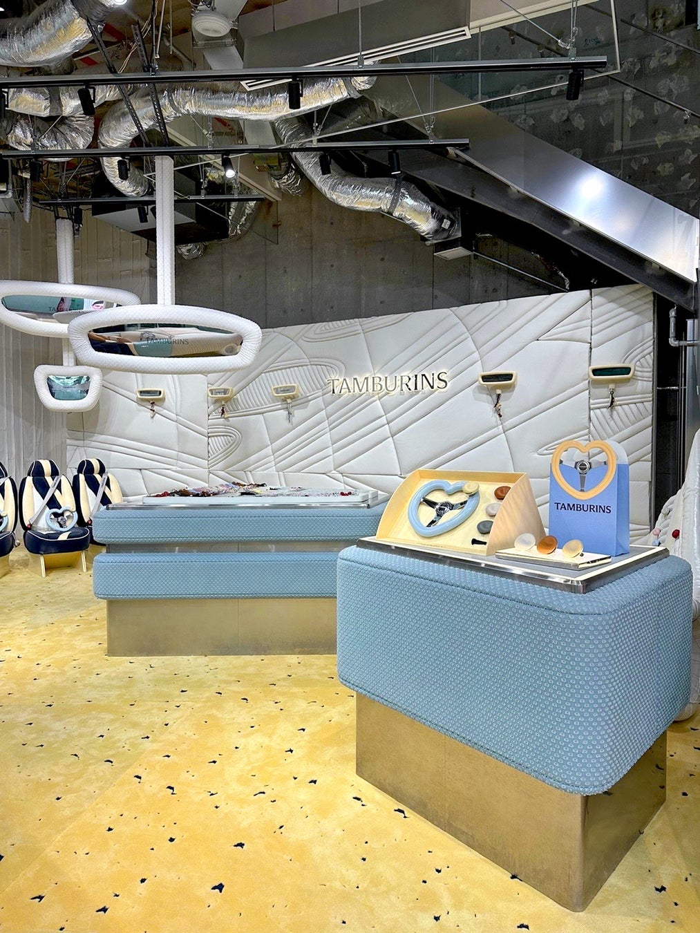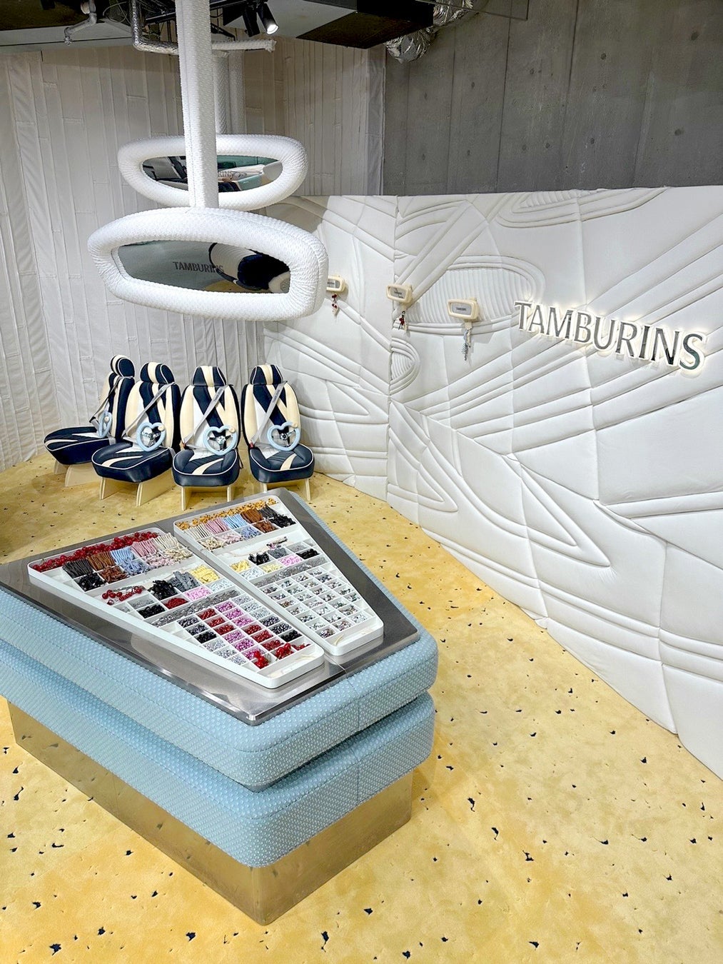 今回のカーディフューザーの発売を記念して、タンバリンズ東京青山フラッグシップストアの1階は、タンバリンズの自動車の世界観を表現するポップアップ空間に変貌した。ほのかな色合いのカーディフューザーからインスピレーションを受けてデザインされた空間は、タンバリンズが想像する美学が込められた自動車を一つのアートウォールとして表現した。他では出会えない個性的なカーシートとハンドルのデザインを通して、タンバリンズならではの新しい美学体験を提供する。