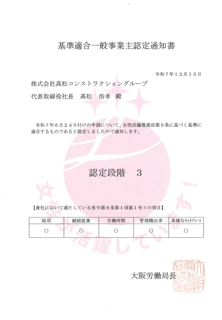 株式会社髙松コンストラクショングループ(本社:大阪市淀川区新北野1-2-3、代表取締役社長:髙松 浩孝)は、女性活躍推進法に基づく優良企業として、2025年12月15日付で厚生労働省が認定する「えるぼし認定(3つ星/3段階目)」を取得しました。